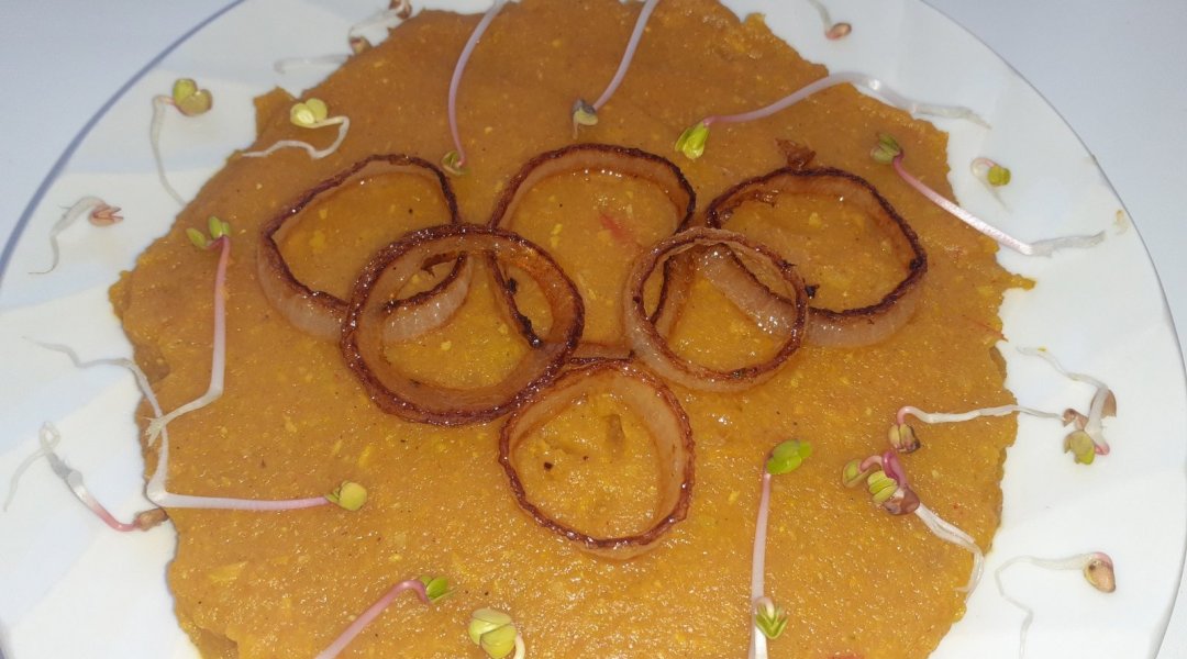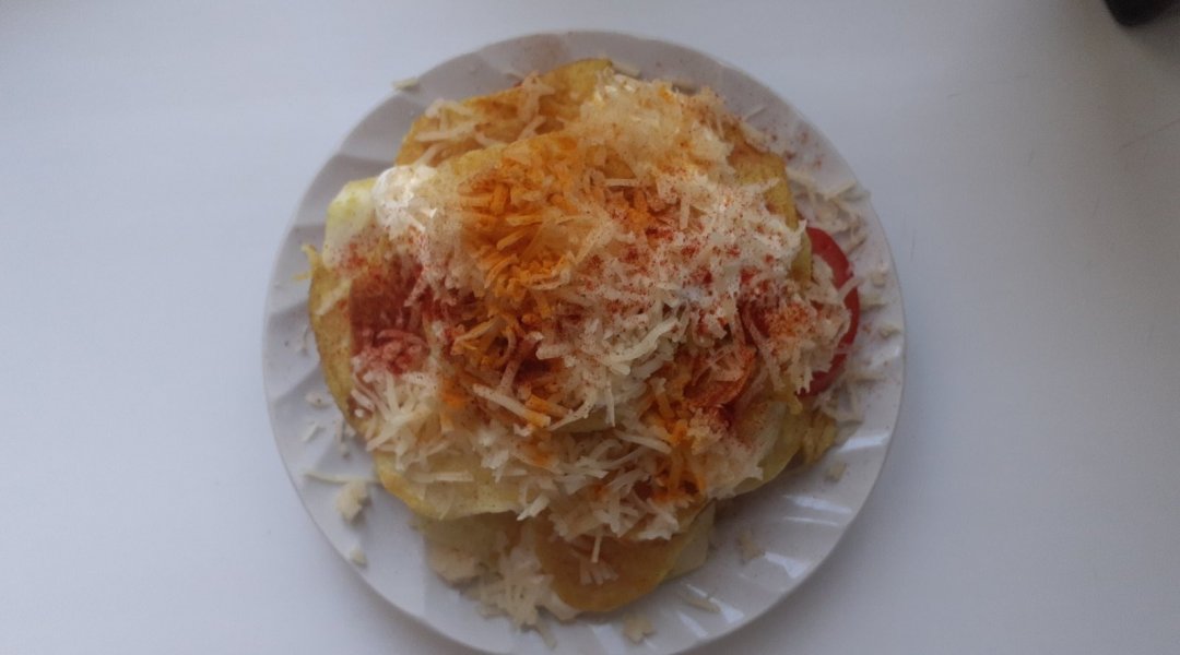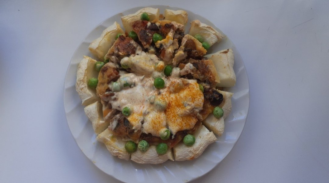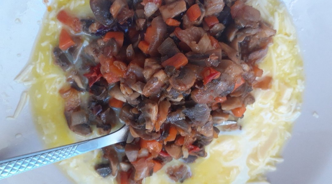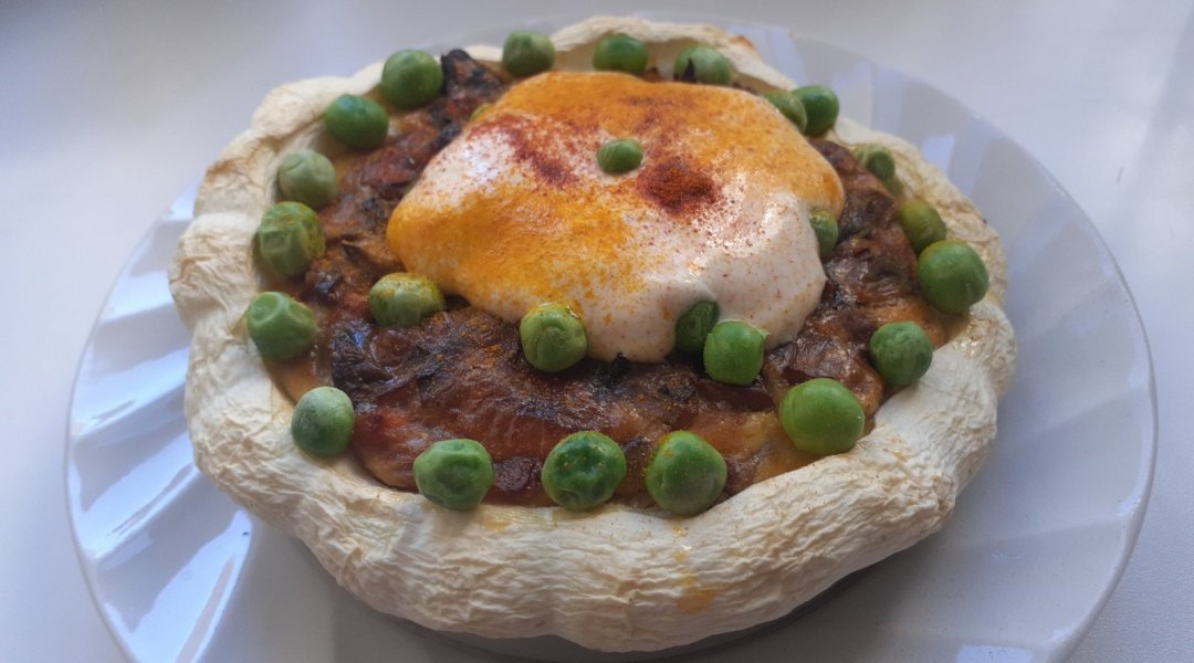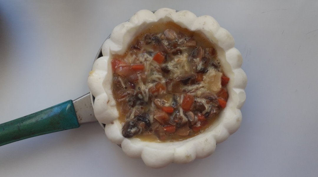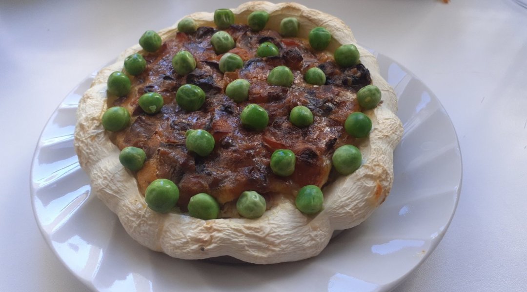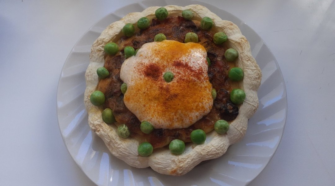 Патиссон помыла, удалила семечки, получилась чашечка. Лук репчатый нарезала четвертинками и поджарила на оливковом маслице с морковью, томатом. Шампиньоны помыла, нарезала, поджарила вместе с зажаркой. Посолила по вкусу. Сыр натерла на мелкой тёрочке, смешала с молоком, яйцом и поджаренными шампиньонами. Получившуюся омлетную массу с шампиньонами, вылила в чашечку из патиссона и запекла в духовочке при 180 градусах 35 минут. Украсила зелёным горошком.В центр положила сметану посыпанную паприкой и куркумой. Вкушала, разрезав на мелкие кусочки, перемешав со сметаной.