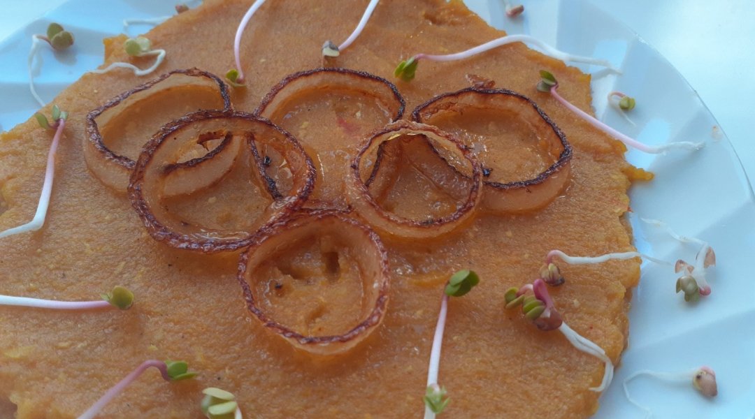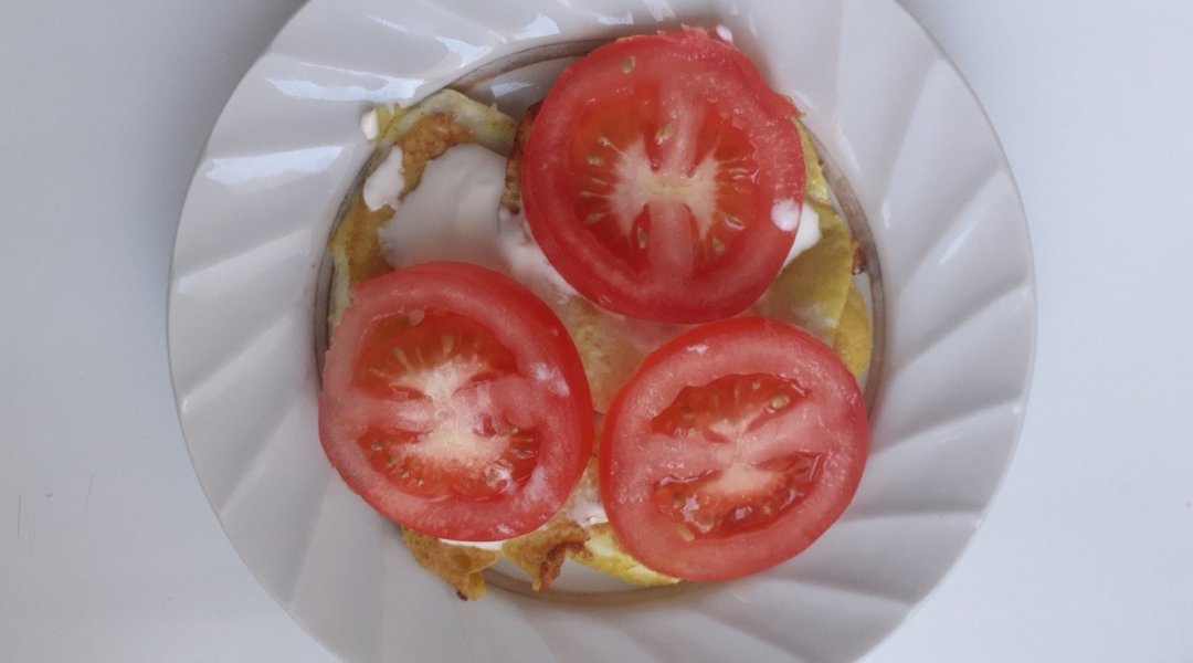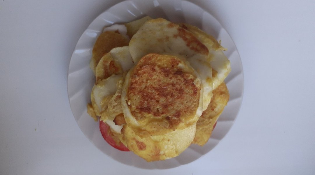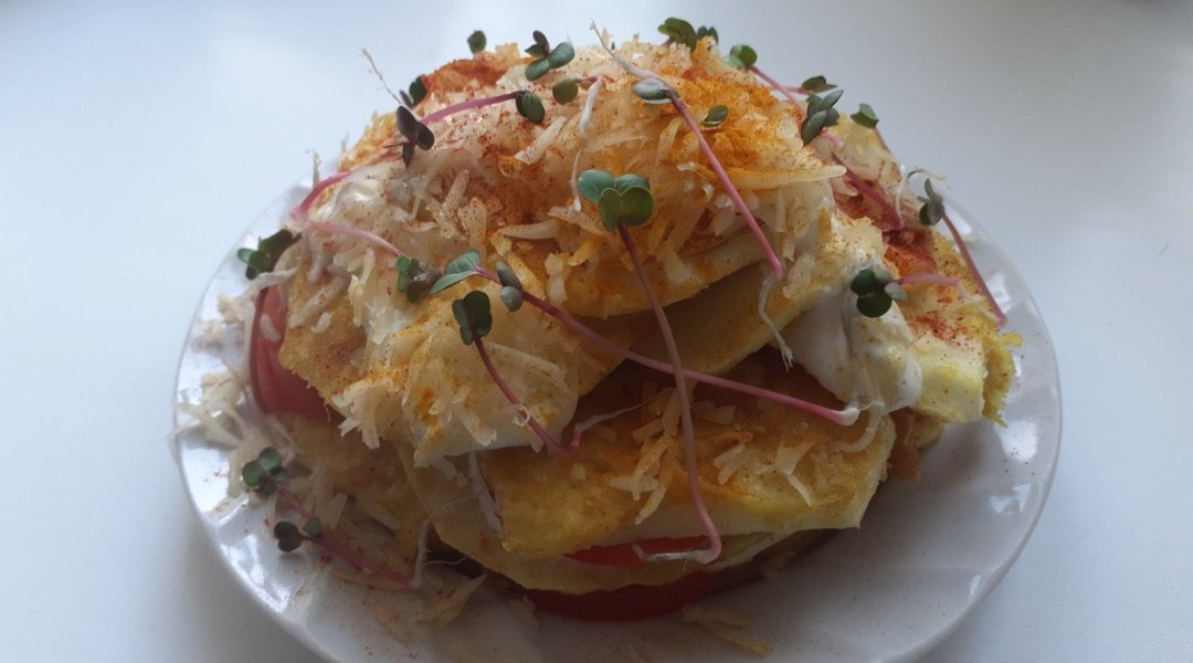 Патиссончики помыла, нарезала тоненькими пластинами, Кунжут растерла в ступке. Приготовила кляр из яйца+кунжут, +мука+ молоко. Пластинки патиссонов посолила,обмакнула в кляр и обжарила на оливковом маслице на тефлоновой сковородочке. Помидорку нарезала на тонкие пластики. Сыр натерла на мелкой тёрочке. Соорудила тортик перекладывая слоями, патиссоны в кунжутном кляре, сметанку, помидоры. Верхний слой посыпала тёртым сыром с чесноком, паприкой, , куркумой, микро зеленью редиса.