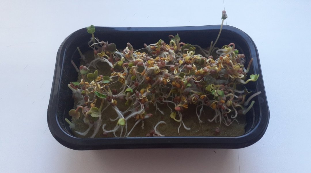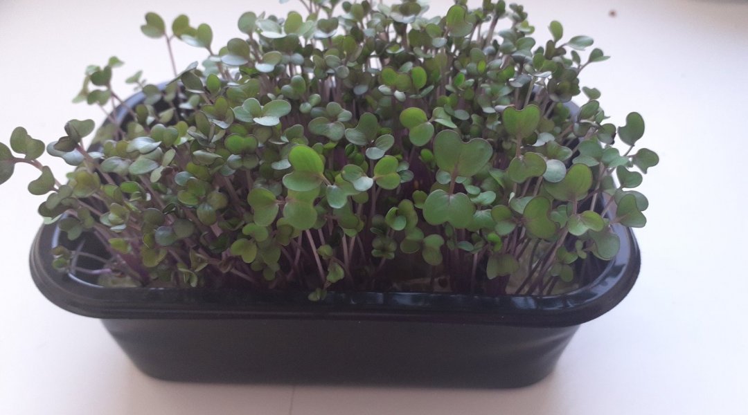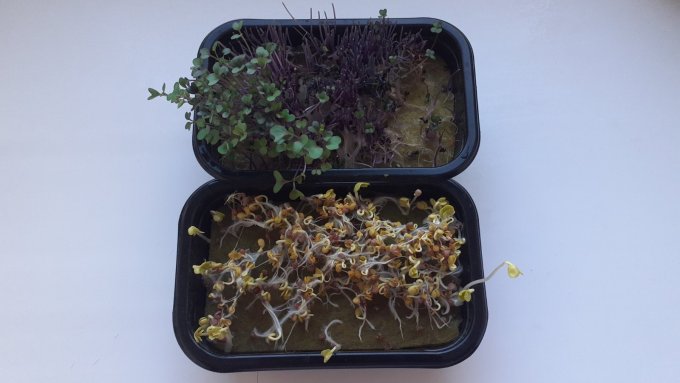 Одну микрозелень уже доедаю, другая подрастает. Жёлтенькая - это проросла редисочка.