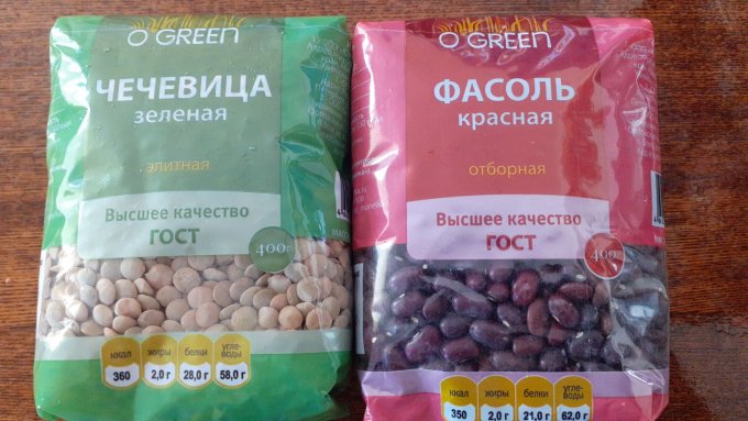 Вот купила упаковочку красной фасоли и упаковочку зелёной чечевицы.
