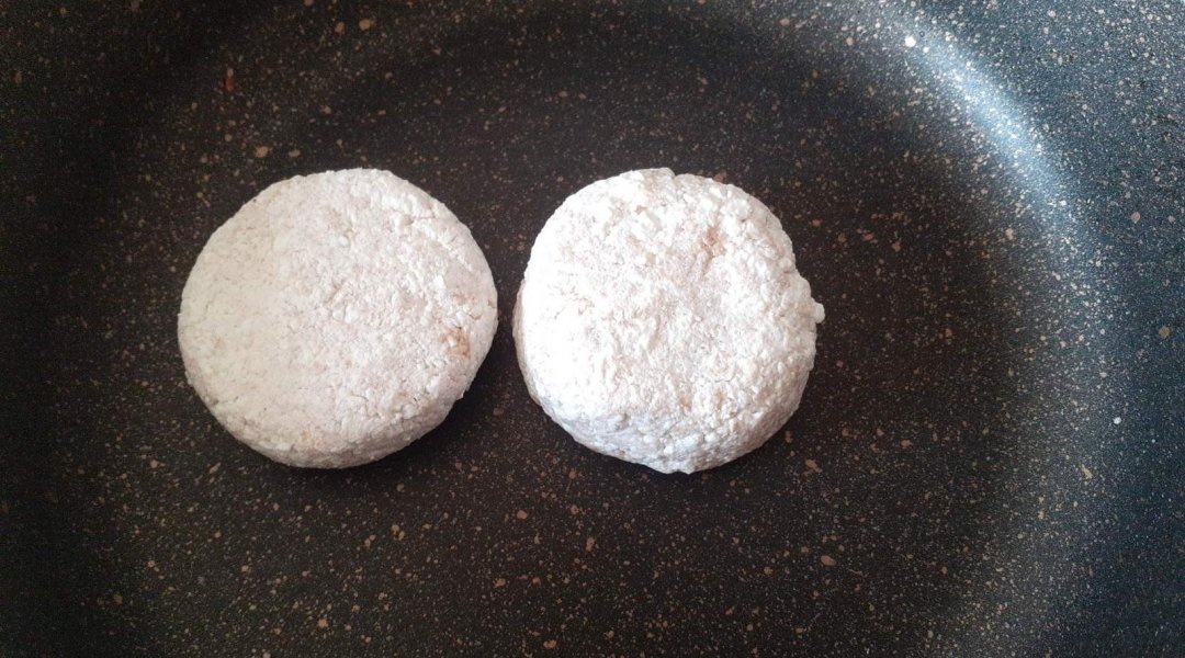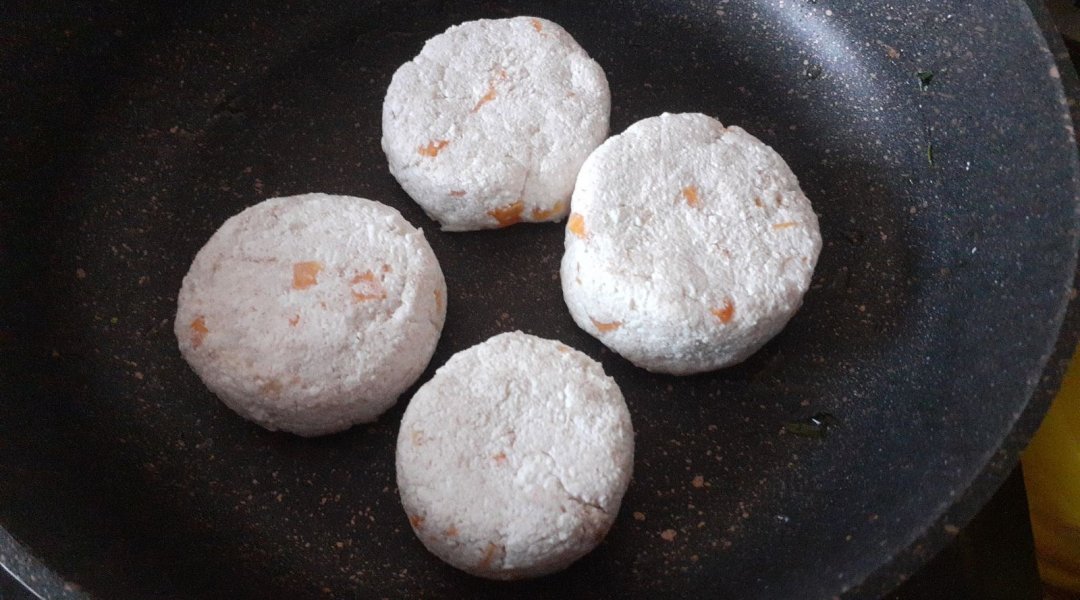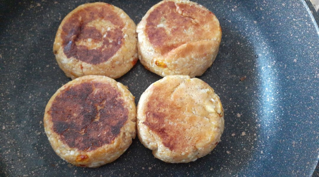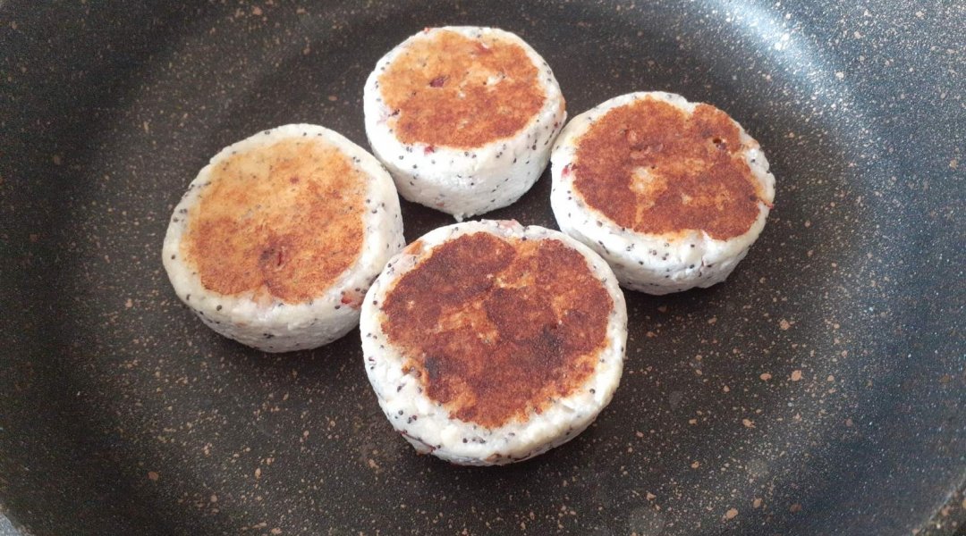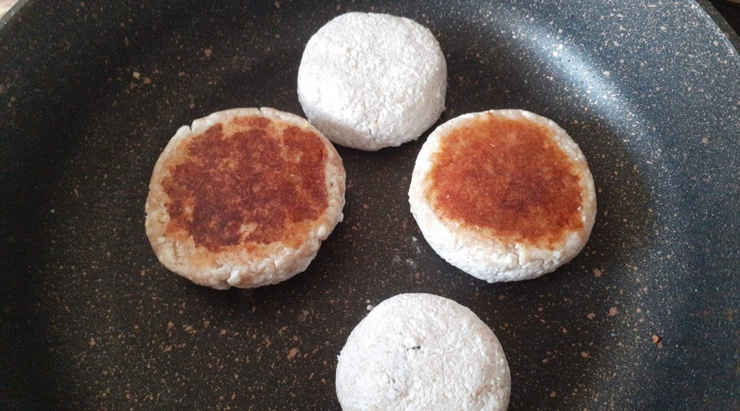 Жарила на тефлоновой сковороде без масла, по 10 минут с каждой стороны. Переворачивала силиконовой лопаткой слегка смазанной маслом, чтобы скользила.