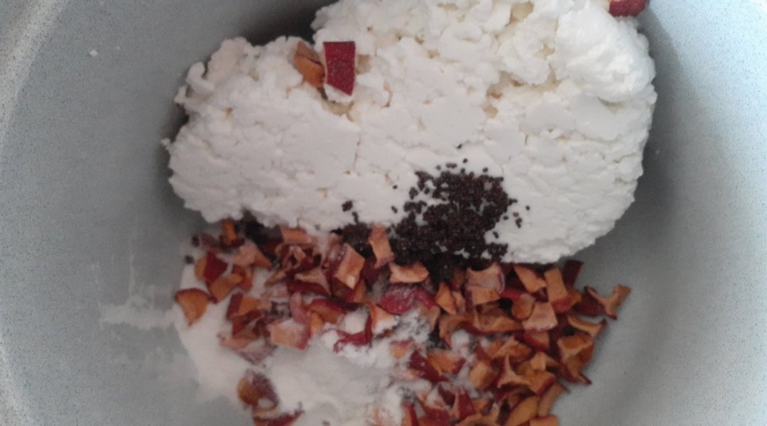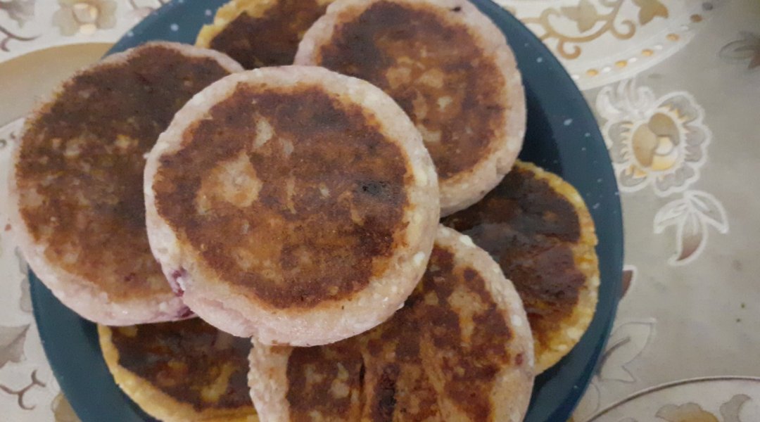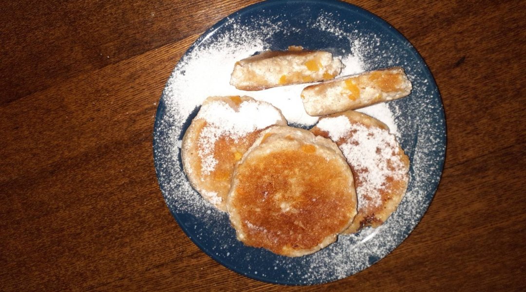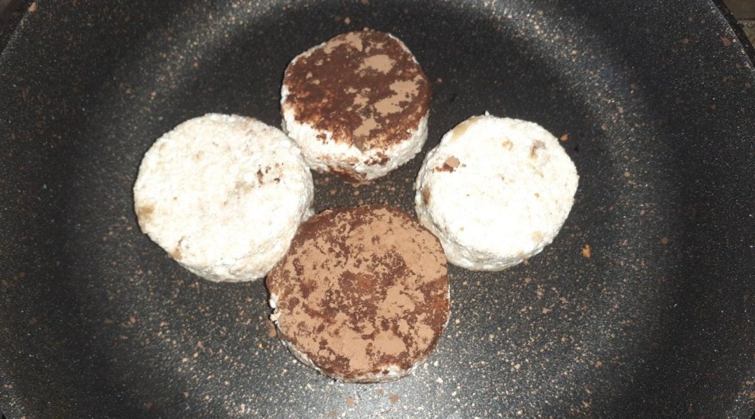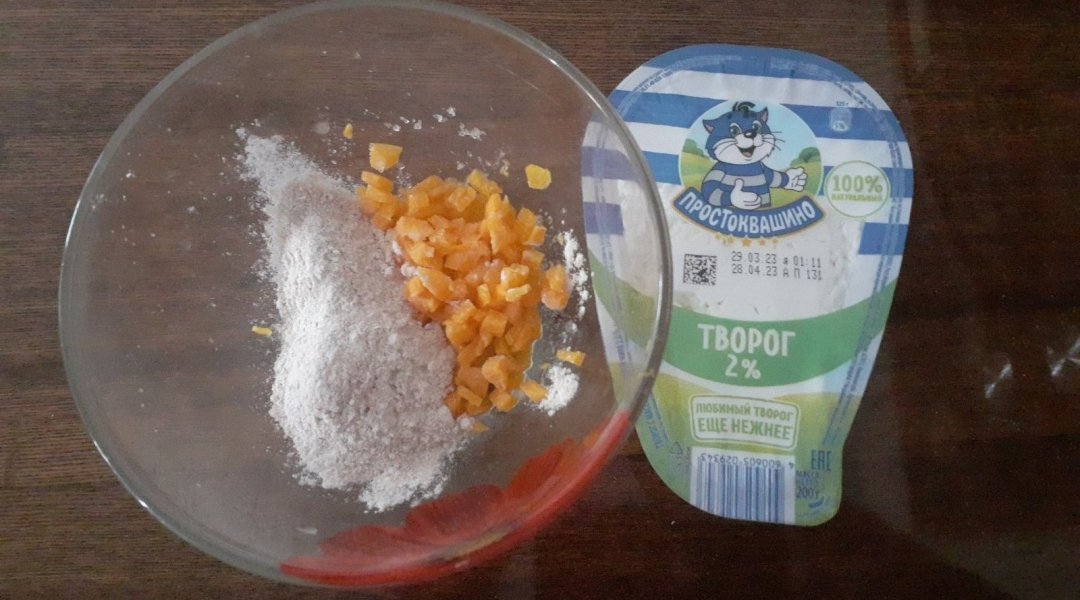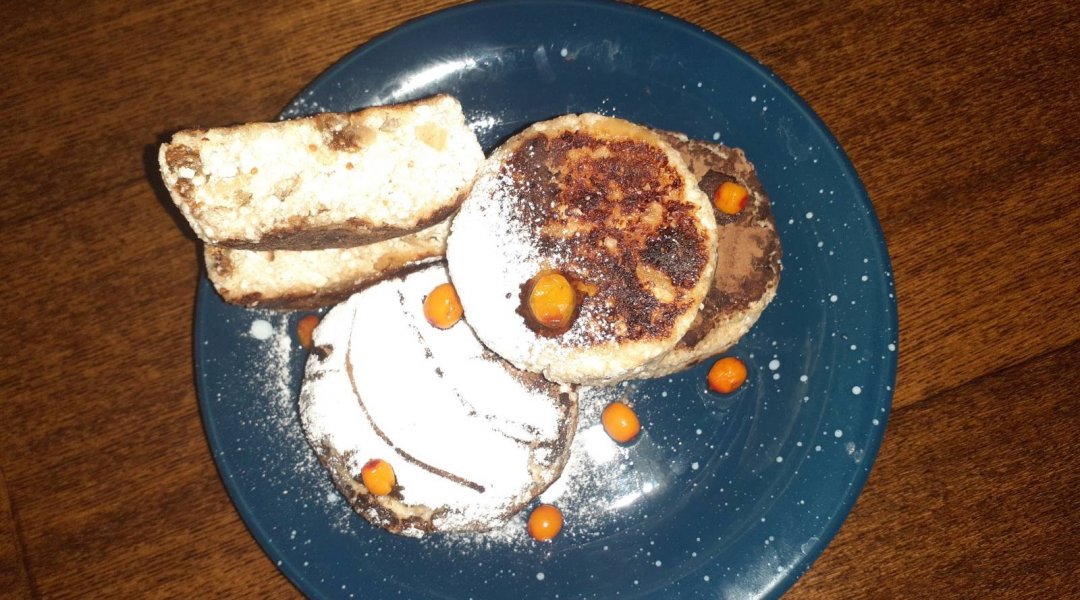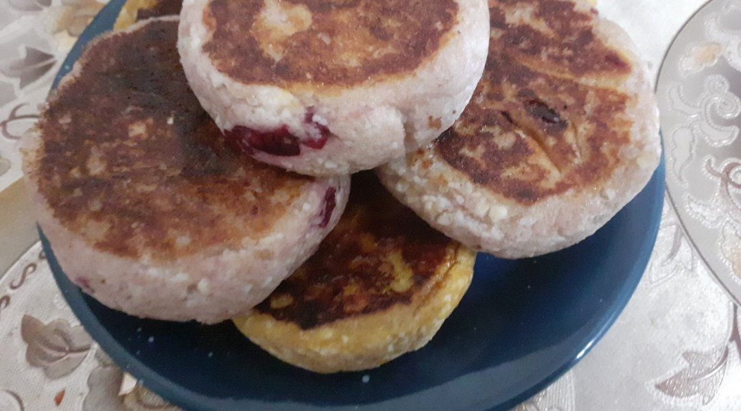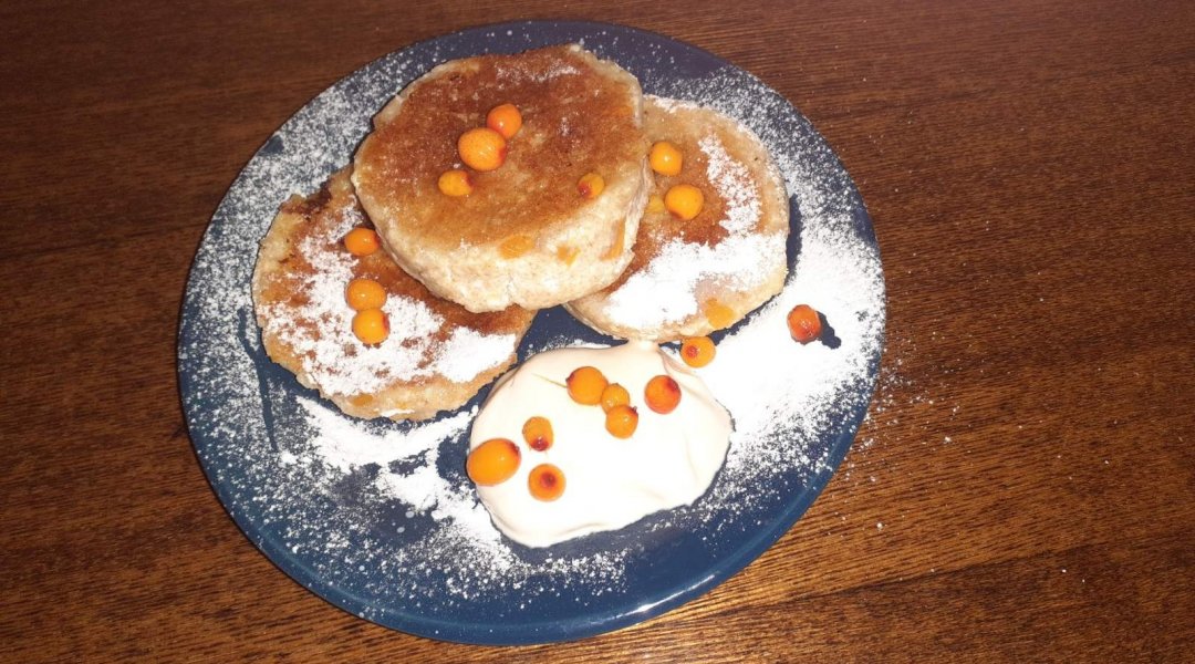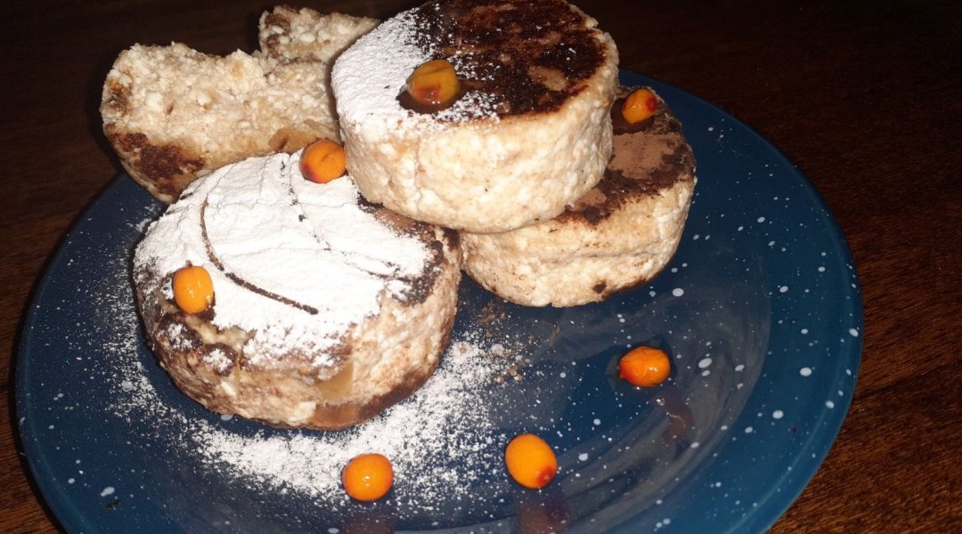 Две пачки творога. Одну смешала с цельнозерновой мукой и облепихой, посолила добавила сахарозаменителя по вкусу, сформировала шайбочки и поджарила на тефлоновой сковороде с двух сторон по 10 минут без масла.Кто любит с сахаром можно добавить сахар по 5 чайных ложечек на одну пачку. Вторую пачку творога смешала с цельнозерновой пшеничной мукой и ягодами брусники, посолила по вкусу и добавила сахарозаменитель по вкусу. Жарила на тефлоновой сковороде без масла с каждой стороны по 10 минута.