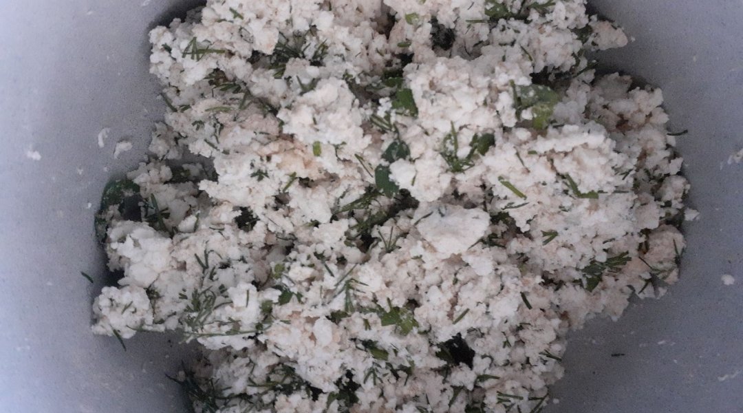 Смешала творог, муку, мелко порезанные укроп и петрушку.
