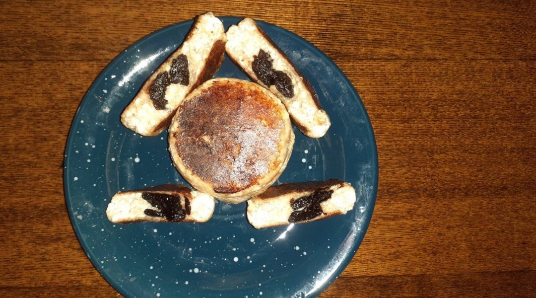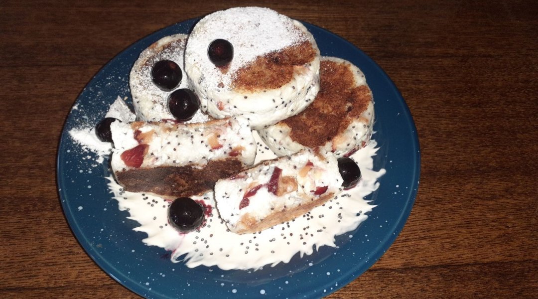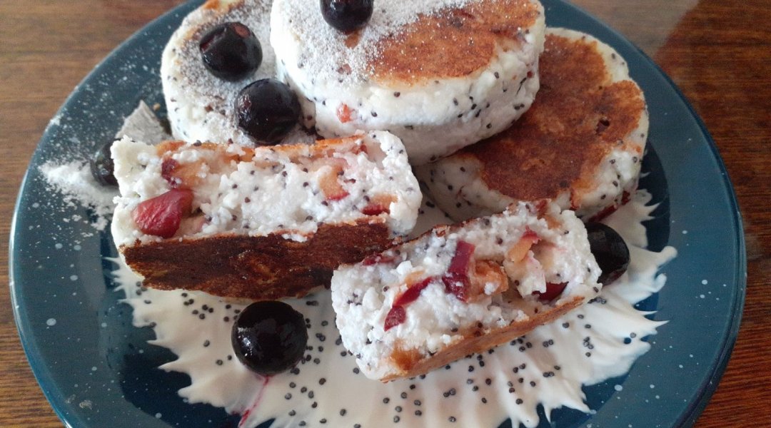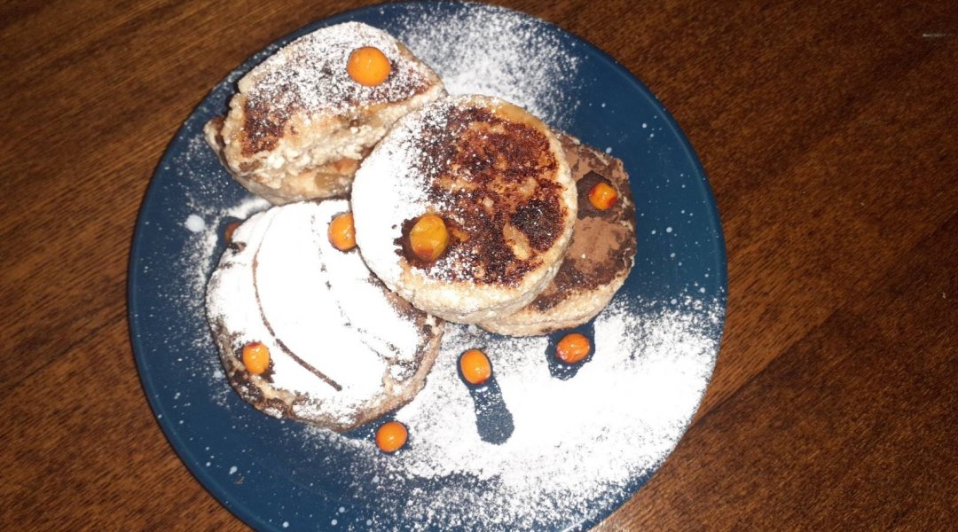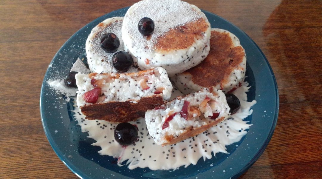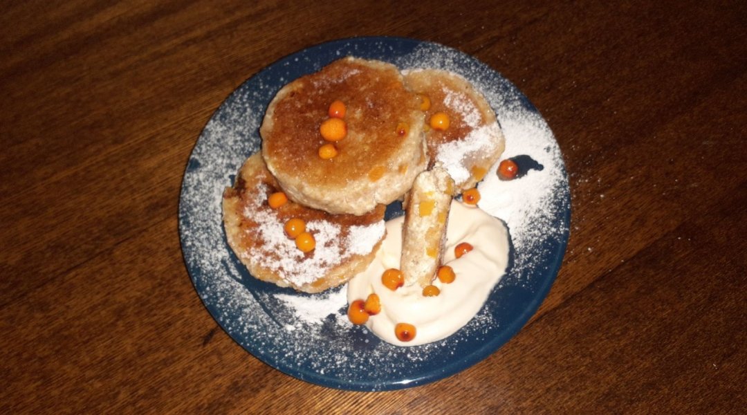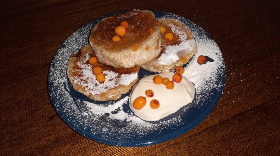 Сырники из творога с брусникой сверху и с облепихой снизу.