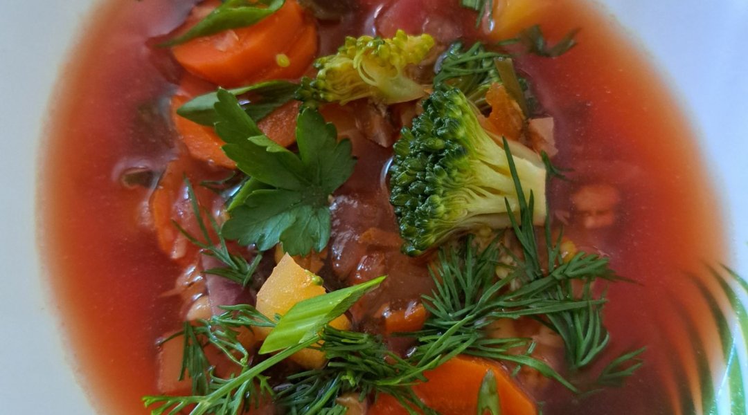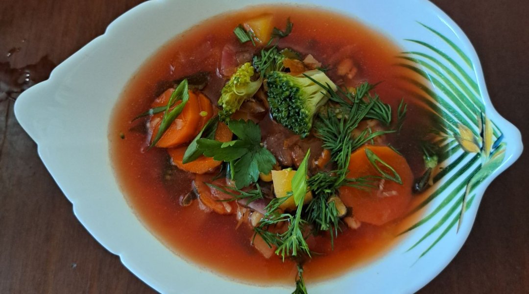 Готовый суп посыпала зеленью петрушки, укропа, зелёного лука.