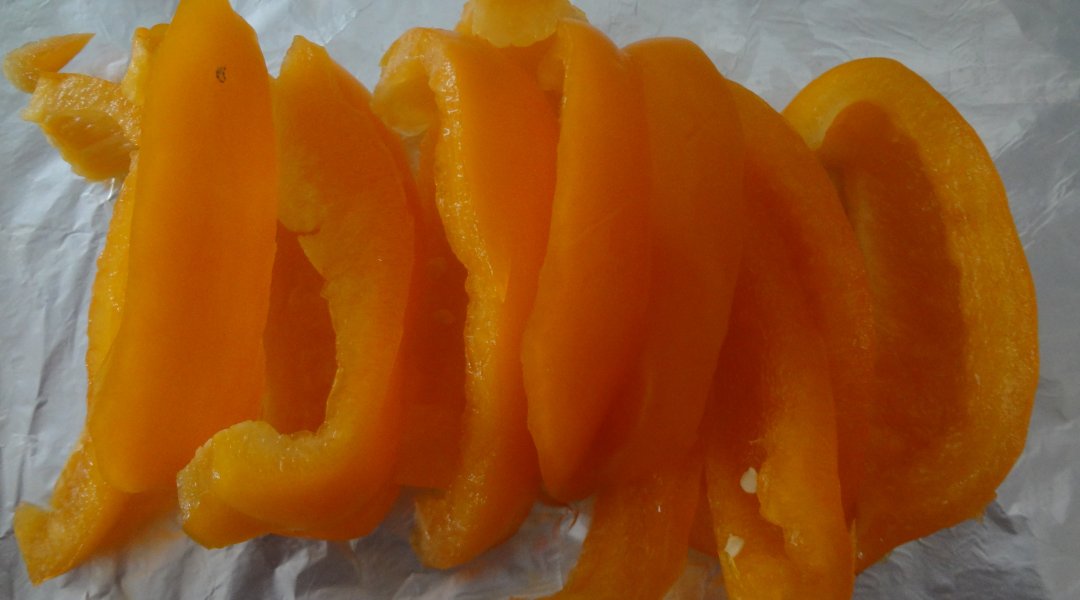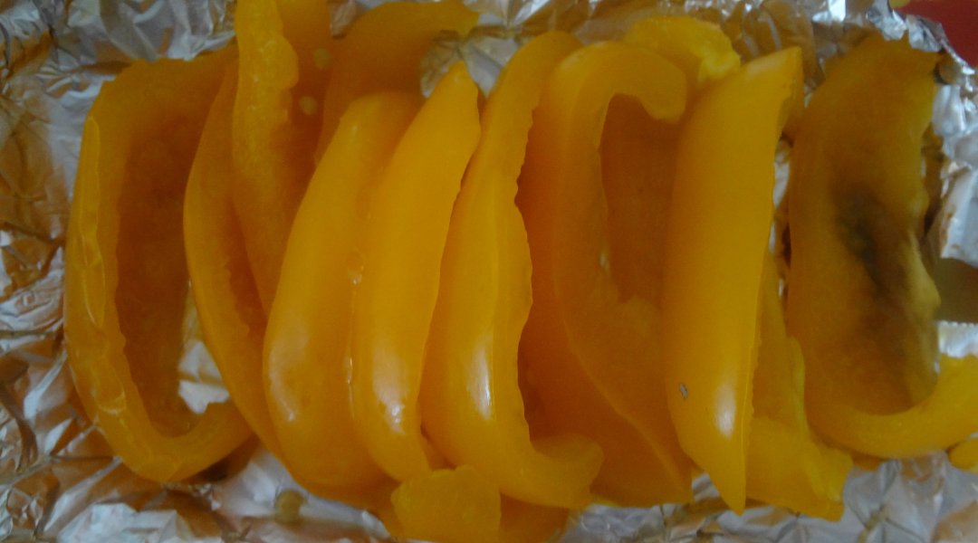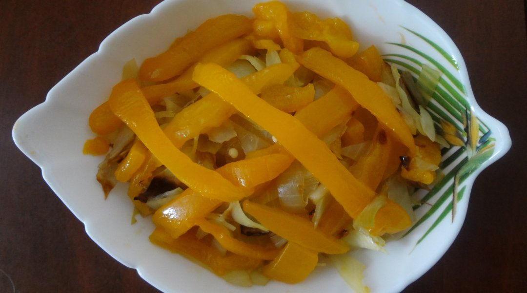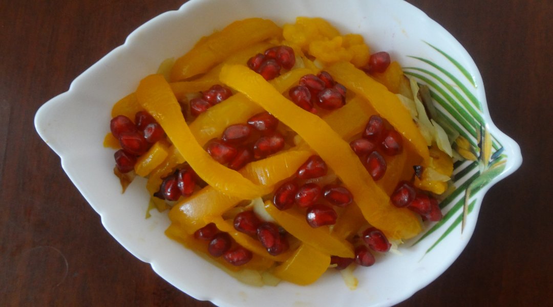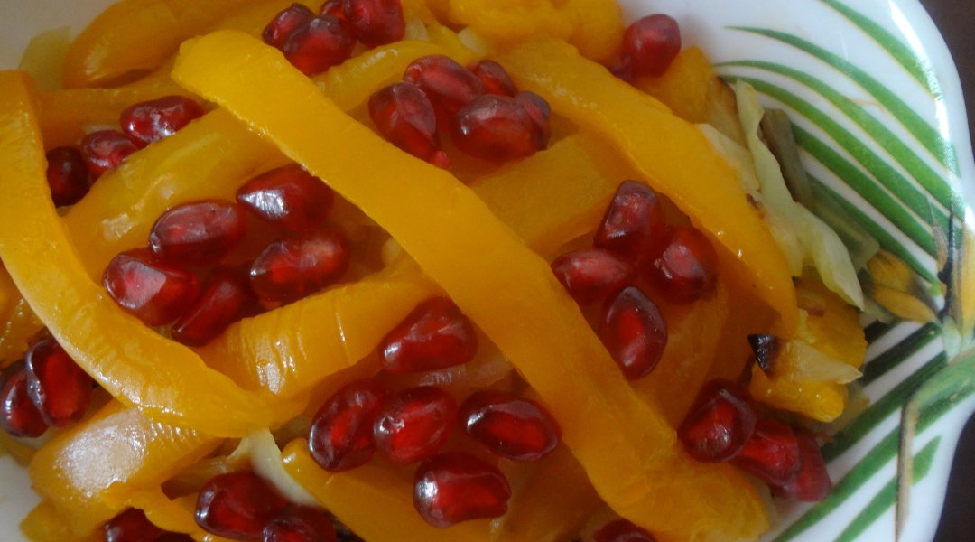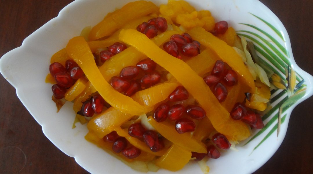 Сладкий перчик помыла, удалила плодоножку, порезала и завернула в фольгу. Листья капусты помыла. Лук почистила нарезала и завернула в фольгу. Выпекала в духовке на 180 градусах полчаса. С запечённого сладкого перчика сняла кожицу. Запечённую капусту нарезала на полоски, слегка посолила, полила маслицем оливковым. Запечённый репчатый лучок нарезала произвольно. Всё смешала и украсила зёрнами граната.