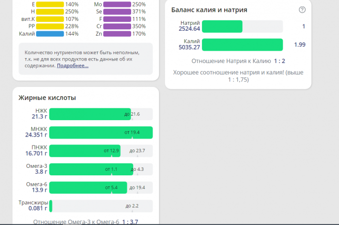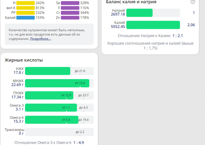 Калорийность - 53.2 кКал; белки - 4.2 г; жиры - 2.8 г; углеводы - 3.3 г на 100 г.