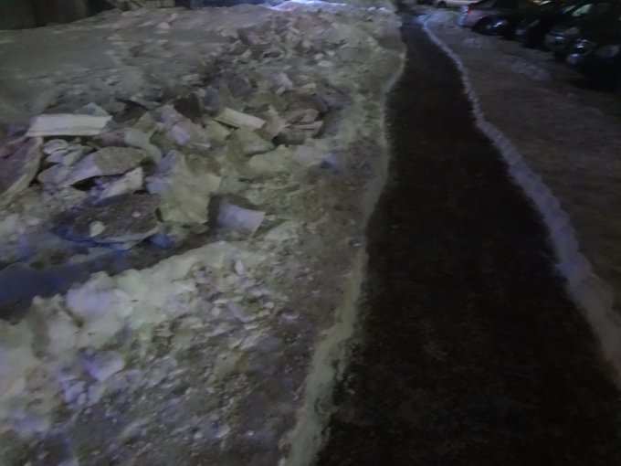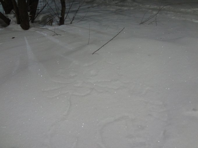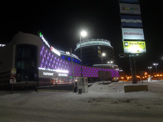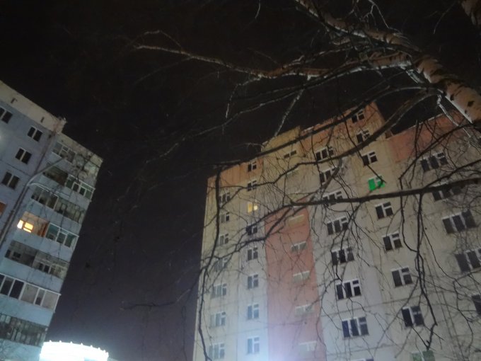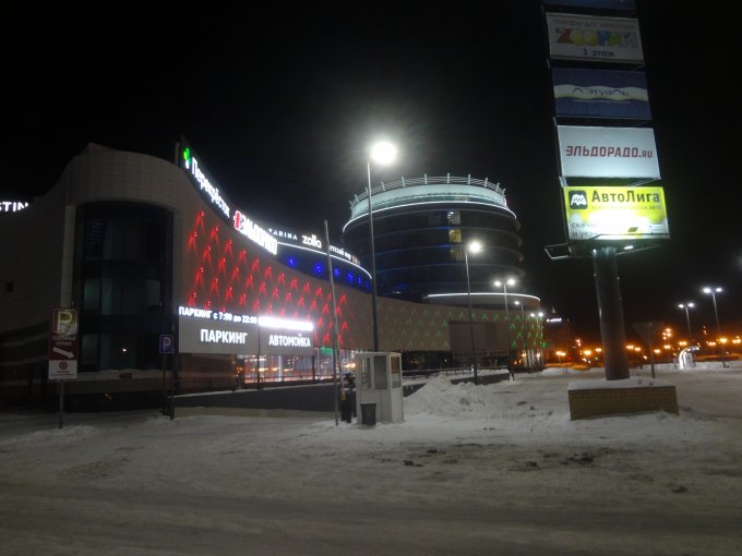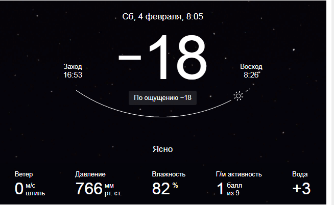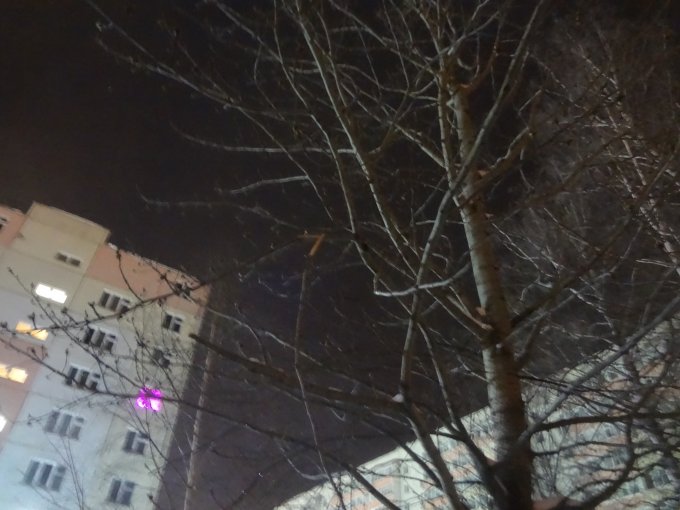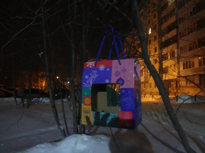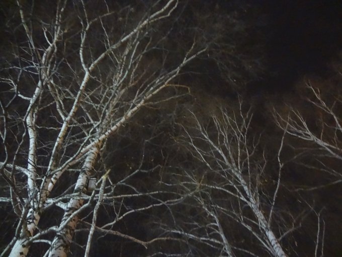 На улице прохладно, слабый ветер, луны  нет. Осадков нет.Кто-то  сделал кормушку для птиц из сумки. Заметила на деревьях у кормушек поломанные ветви берёз, довольно высоко. Неужели обламываются от мороза и тяжести садящихся птиц, ветра сильного вроде не было. Жемчужина опять зажгла свои огни и радует этим прохожих рано спешащих на работу.