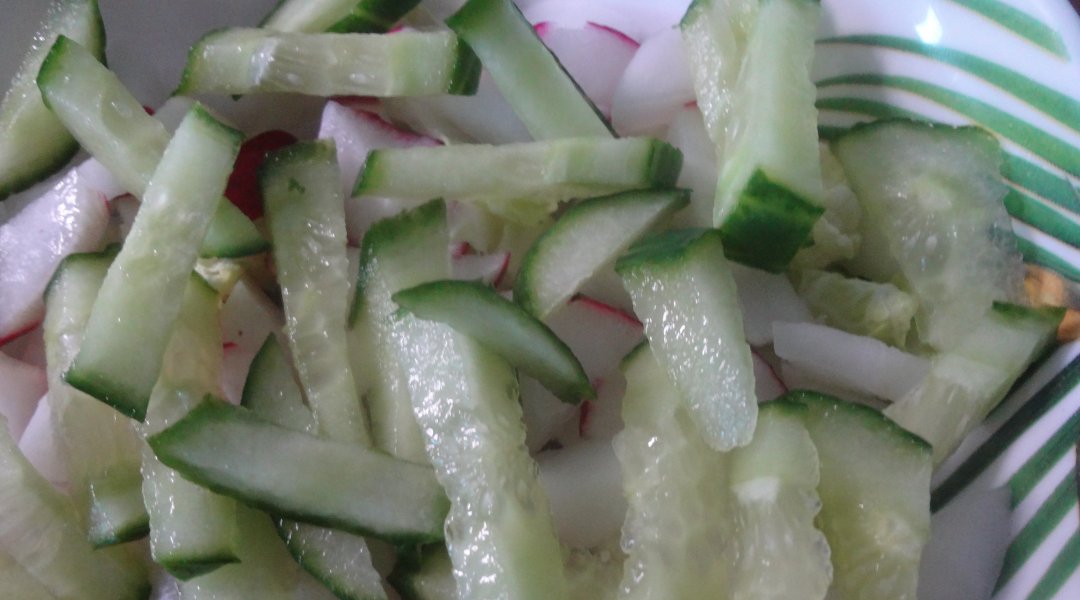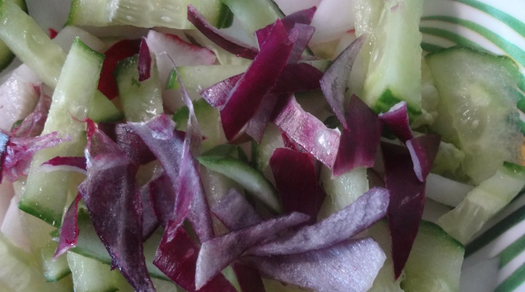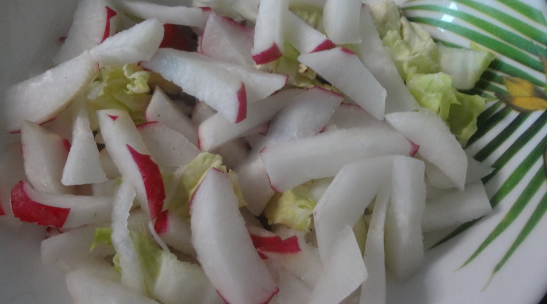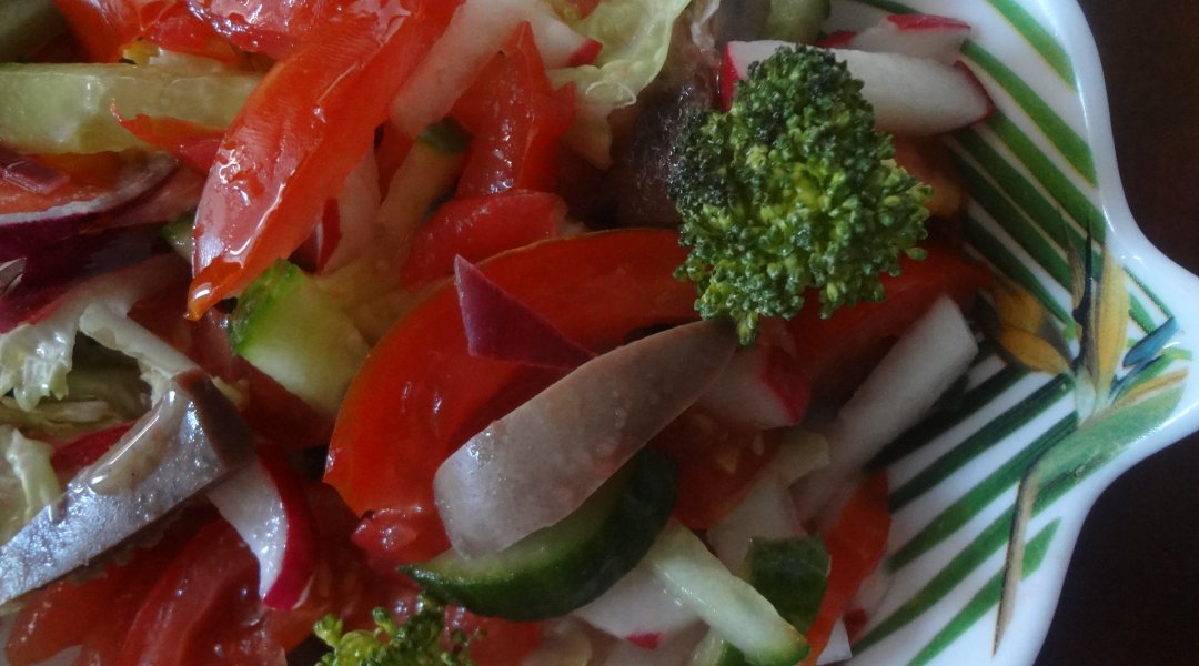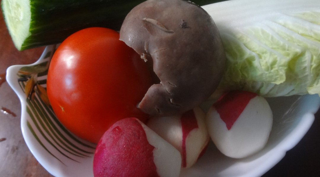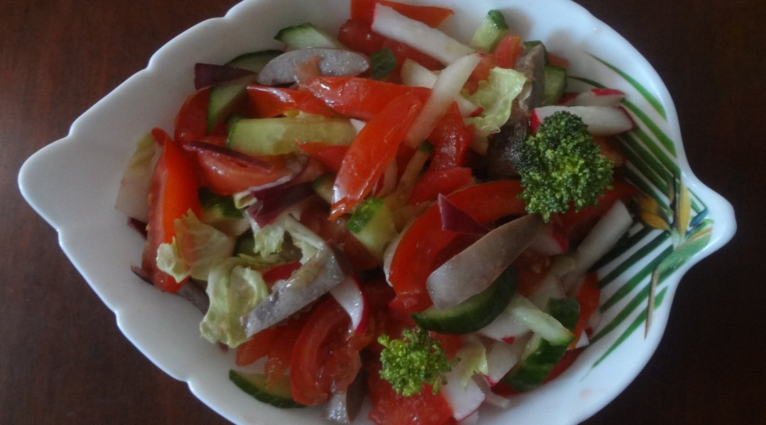 Почки вымочила 6 ч. в воде, меняя несколько раз воду. Варила 10 минут в первой воде, воду слила. Варила ещё 50 минут во второй воде. Воду слила.Варёные почки порезала соломкой, затем, нарвала мелкими кусочками пекинскую капусту, вымыла и нарезала соломкой редис, репчатый красный лучок и дольками помидорку, добавила соцветия брокколи, полила яблочным уксусом и посолила по вкусу. Полила оливковым маслицем и всё перемешала.