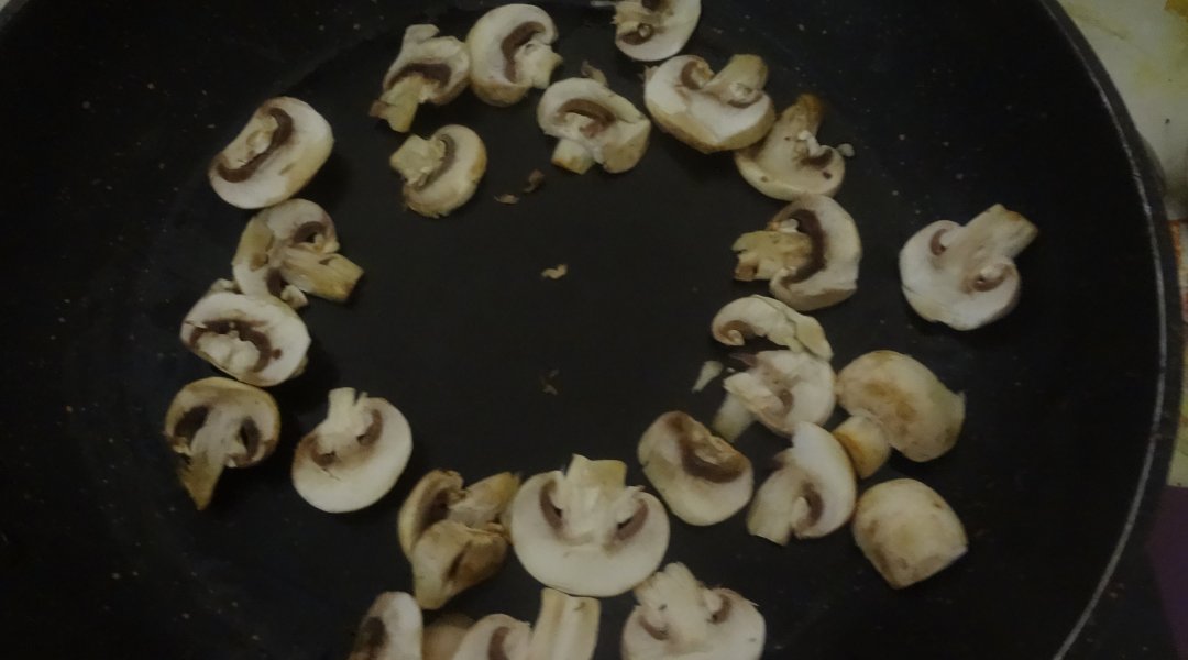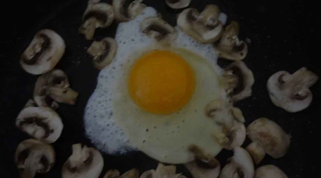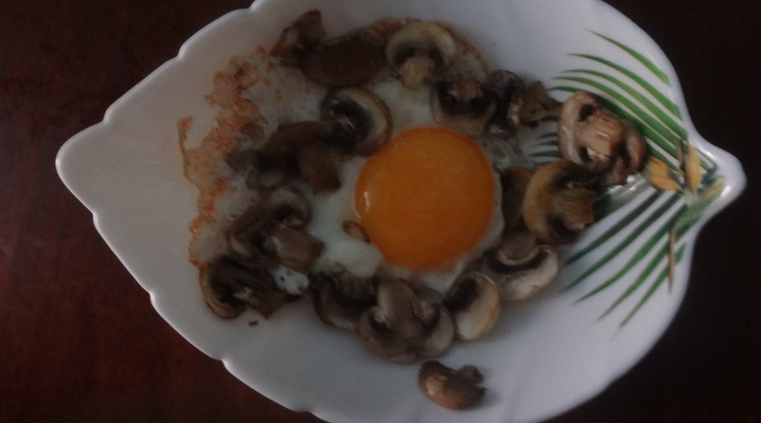 Шампиньоны помыла, почистила, нарезала на пластинки, выложила на смазанную кокосовым маслицем сковороду. Харила на 120 градусах 2 минуты, добавила в середину куриное яичко , посолила по вкусу и жарила ещё 5 минут