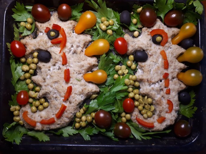 На гарнир свежие помидорки трёх цветов, маслины, зелёный горошек