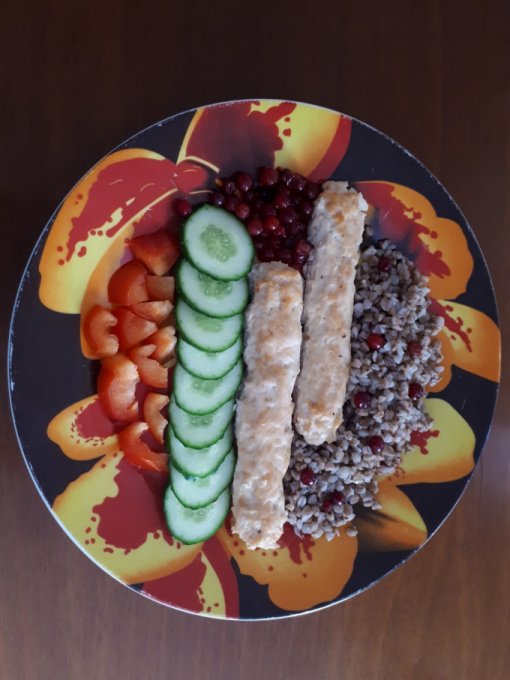 К колбаскам отварная гречка с маслом, в нарезке огурец и