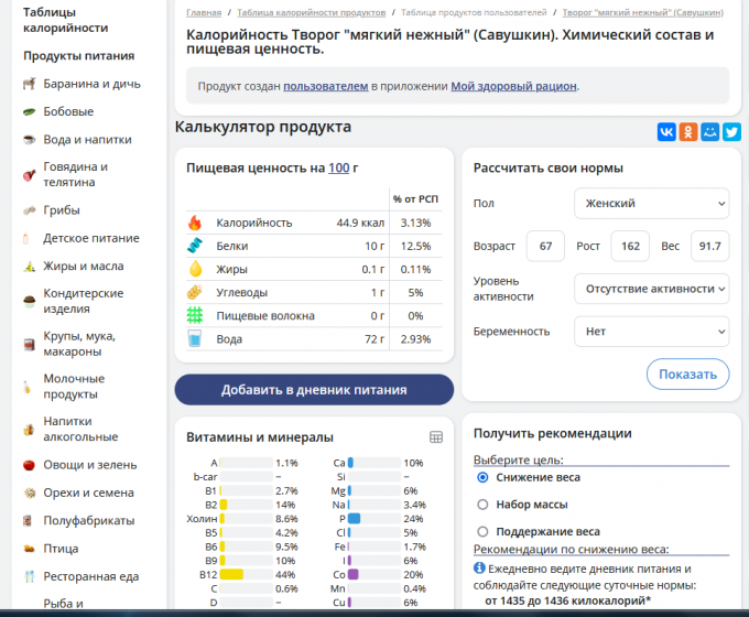 химического состава для Творог "Мягкий нежный" обезжиренный