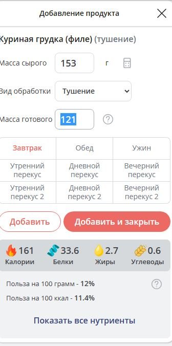 | Грудка цыплёнка 5 окт. 2023 г. | 121 г |