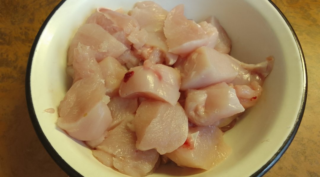 весом 756 г. Острым ножом Я аккуратно сняла кожу с курицы и куриной