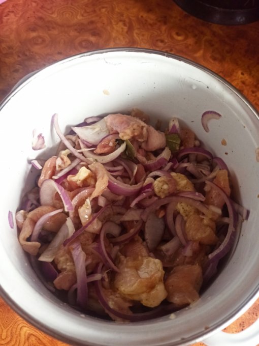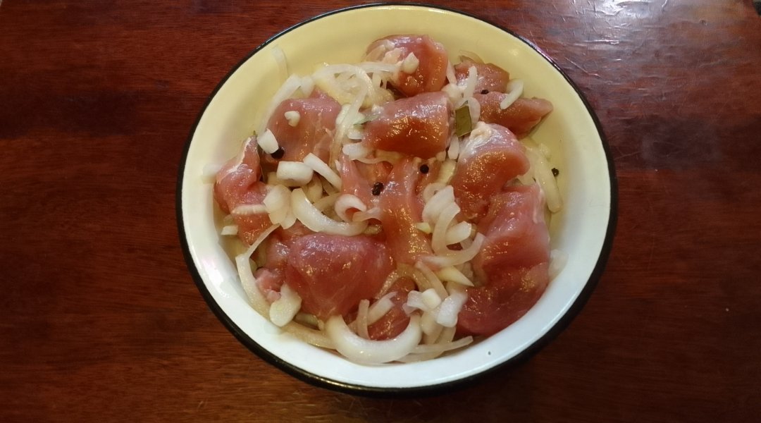 Лука должно быть примерно столько же визуально сколько и мяса.