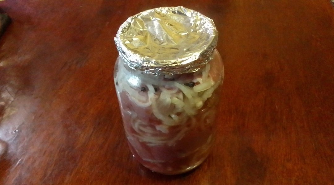 из неё из неё подобие крышки. Накройте банку с мясом этой крышкой