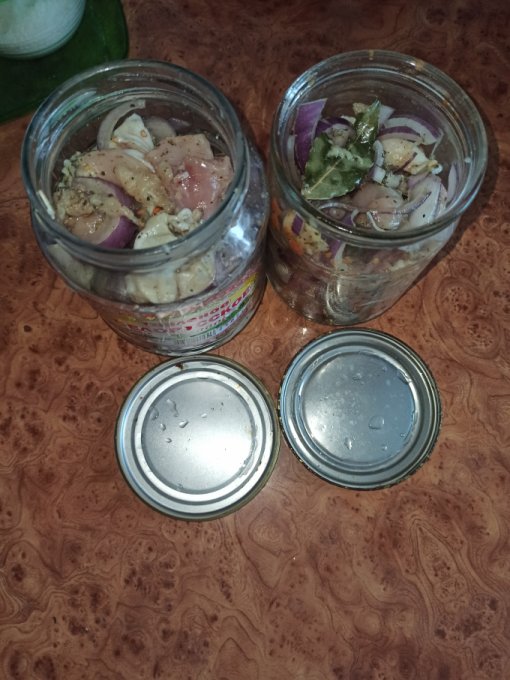 Переложите мясо в литровую банку. Влейте образовавшийся сок так