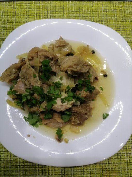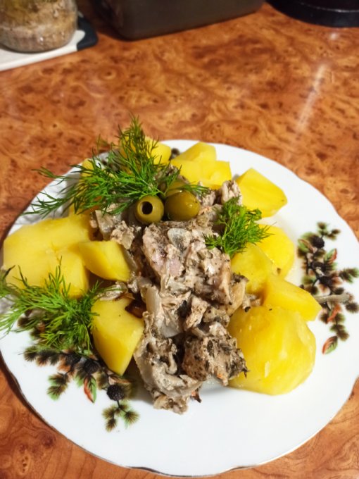 банку. Положите на блюдо гарнир, сверху на гарнир можете выложить
