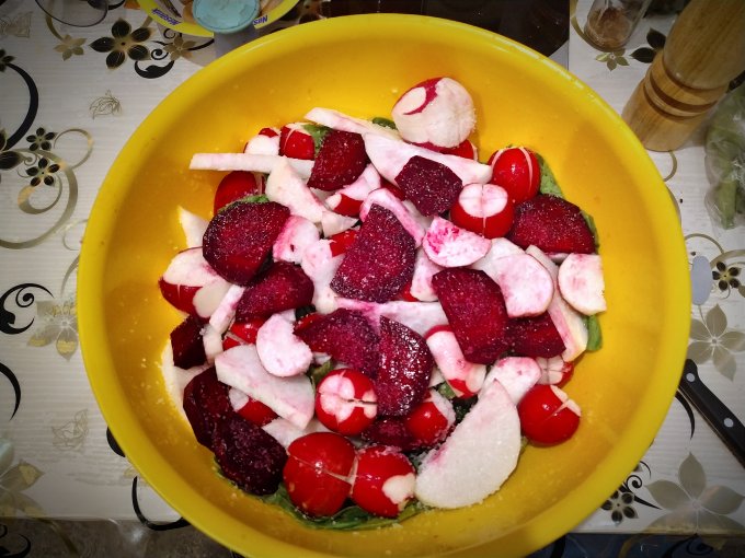 Всем привет! Заиграл зов крови, корейские предки дают о себе знать))), решил заквасить овощи (кимчи, ферментация), называйте как хотите! Я люблю остренькое и чтобы полезно. Основа- моя любимая редиска с ботвой, далее огурцы, редька дайкон, свекла, чеснок, перец среднеострый. Сначала всё солим морской солью, оставляем на час, полтора, промываем, добавляем специи по вкусу, немного сахара (для братьев меньших), добавил ещё укроп зонтик и листья хрена, хорошо перемешиваем, "заражаем" молочнокислыми бактериями (пусть они едят сахар, а нам дают молочную кислоту), на этот раз добавил кумыс пару ложек. Ставим все под гнет. Через три дня будет готово, далее по банкам и в холодильник! Очень люблю такие овощи, хоть так есть хоть в салат, хоть к мясу...очень вкусно и полезно! Кстати в таком блюде лактобактерий поболее чем в любом йогурте или кефире
