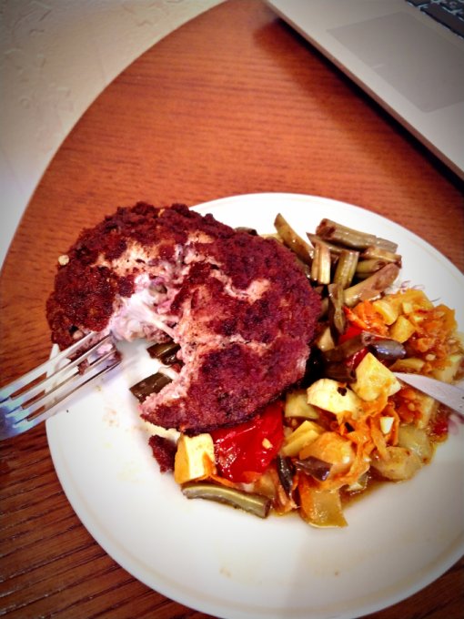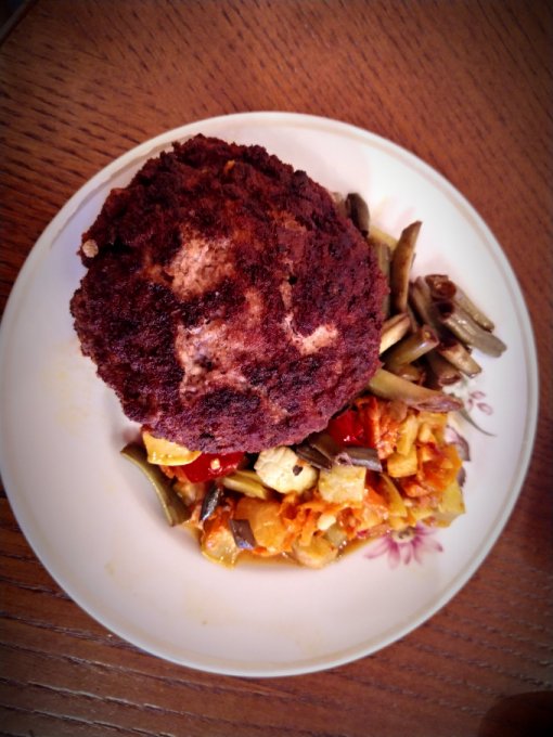 Два бифштекса, на гарнир рагу из овощей то что было под рукой, кабачок, помидор, морковь это с огорода и фасоль стручковая, зелень само собой, очень сытный обед получился, но все равно не более 1500 ккал, с учётом перекуса в бане, даже норму не набрал. Точно будет ясно завтра на тренировке.