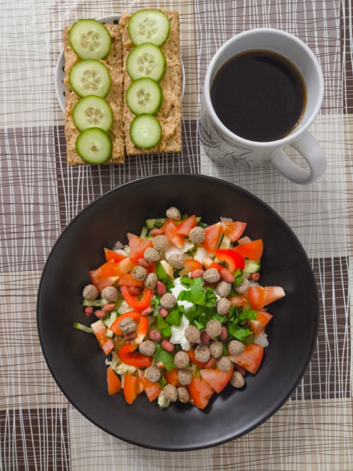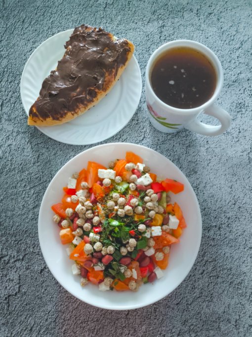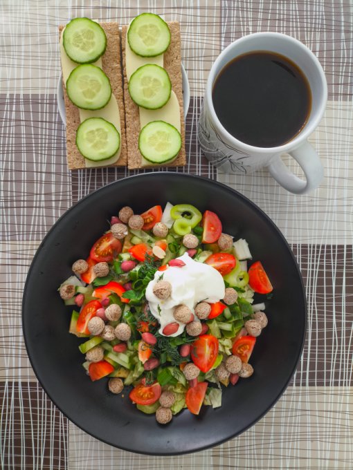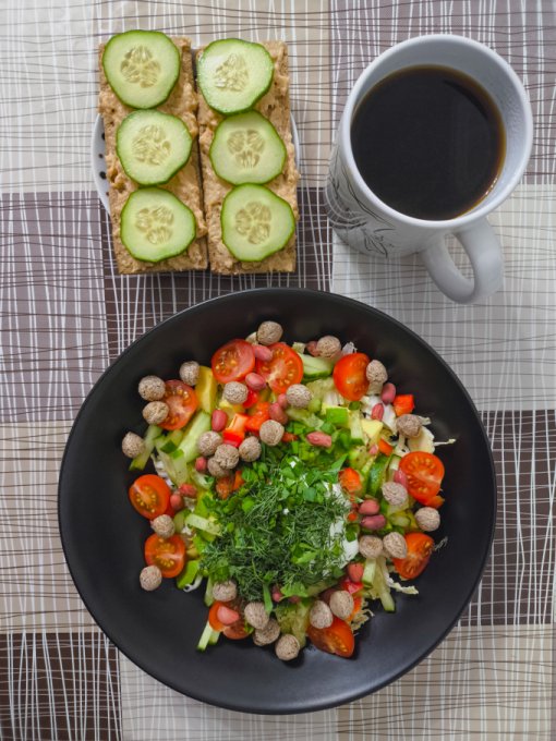• Завтрак: салат (томаты, огурец, красный болгарский перец, пекинская капуста, авокадо, сметана, зелень, арахис, отруби Бородинские), цикорий, 2 хлебца Ржаных Бородинских с сыром Сулугуни и огурцом.