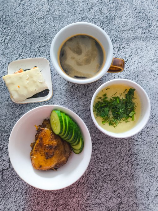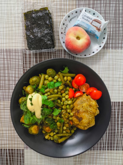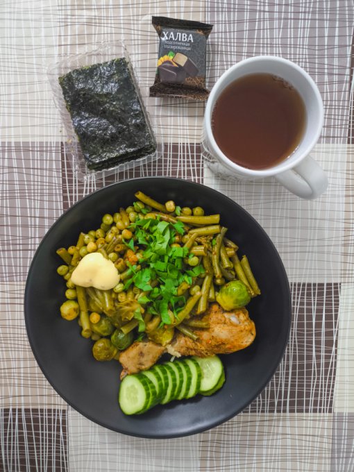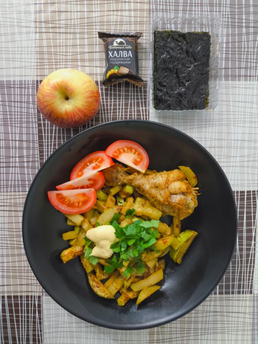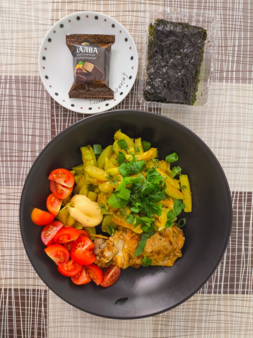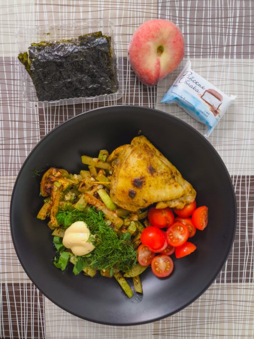 • Обед: куриное бедро, кабачок жареный на сливочном масле с зеленью и Медово-горчичным соусом, томаты черри, чипсы из нори, кофе черный, халва подсолнечная глазированная.