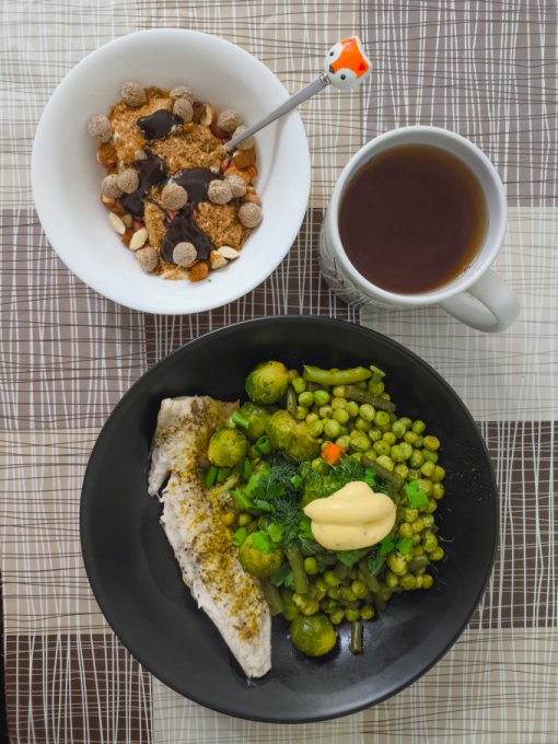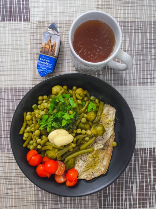 • Ужин: скумбрия, стручковая фасоль, зеленый горошек, брюссельская капуста с Медово-горчичным соусом и зеленью, чай черный, мягкий творожок с отрубями, арахисом, миндалем, фундуком, низкоуглеводным сиропом со вкусом Молочный шоколад.