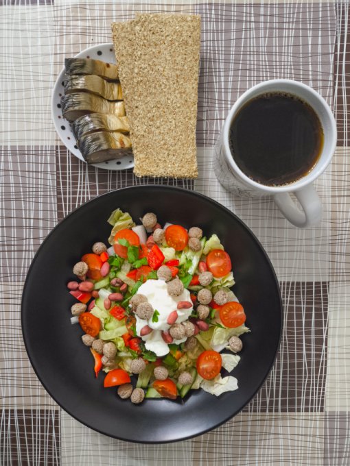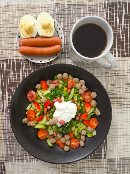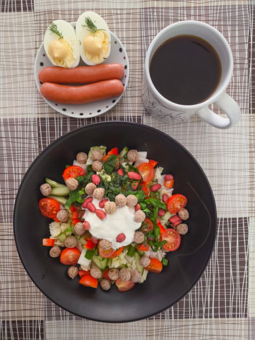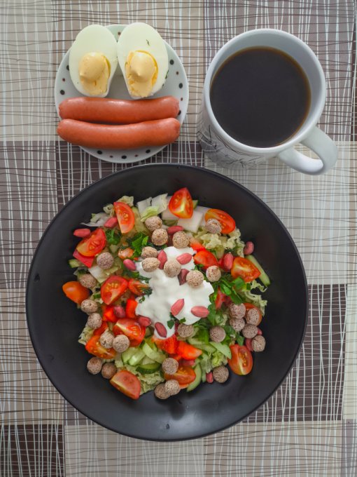 • Завтрак: салат (томаты, огурец, красный болгарский перец, пекинская капуста, авокадо, сметана, зелень, арахис, отруби Бородинские), цикорий, яйцо С0 и 2 сосиски Баварские вареные с Медово-горчичным соусом.