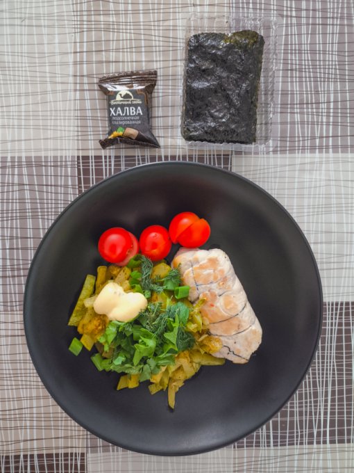 • Обед: рулетик из куриной грудки с сыром Фета, кабачок жареный на сливочном масле с зеленью и Медово-горчичным соусом, томаты черри, чипсы из нори, кофе черный, халва подсолнечная глазированная.