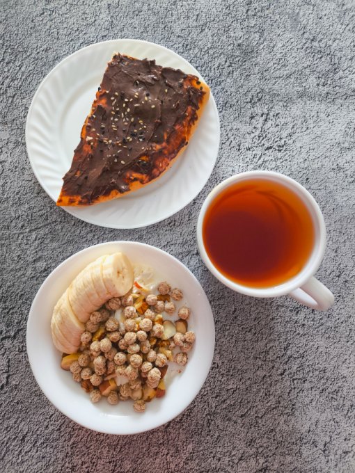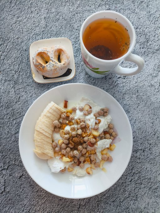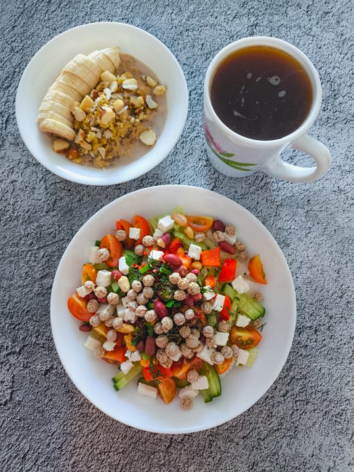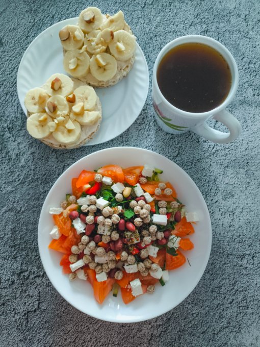• Завтрак: салат (томаты, огурец, красный болгарский перец, пекинская капуста, сельдерей, льняное масло, яблочный уксус, сыр Фета, зелень, арахис жареный, отруби Сила трав), цикорий, каша из пшенной и перловой круп на козьем молоке с бананом и бразильскими орехами.