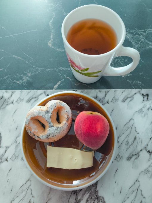 • Перекус: чай травяной, персик, пряник заварной Смаковая булочка, шоколад с начинкой Фундук-фисташка.