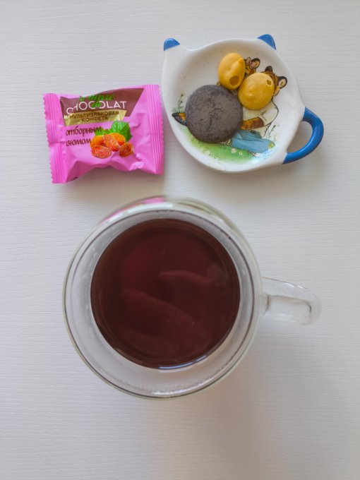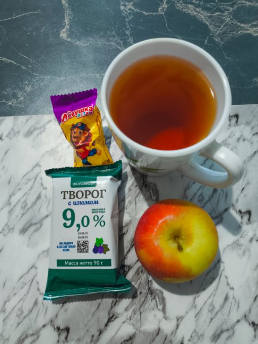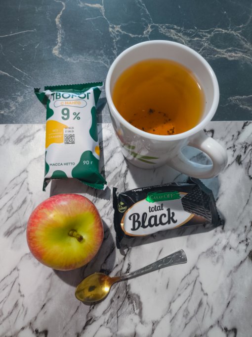 • Перекус: чай травяной, творог с манго без сахара, яблоко, конфета вафельная Total Black.