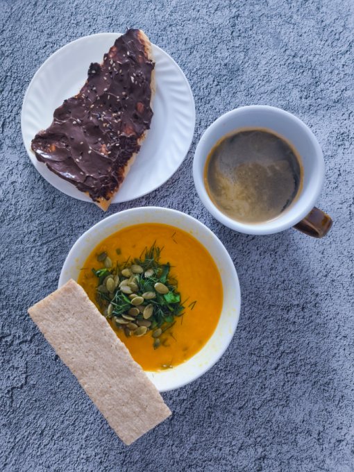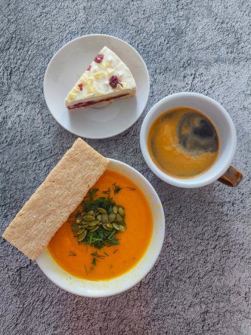 • Обед: тыквенный крем-суп на плавленом сырке с морской капустой, зеленью и тыквенными семечками, хлебец со вкусом лука, кофе черный, торт Брусничный с белым шоколадом.