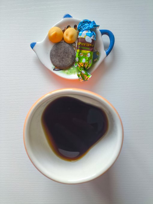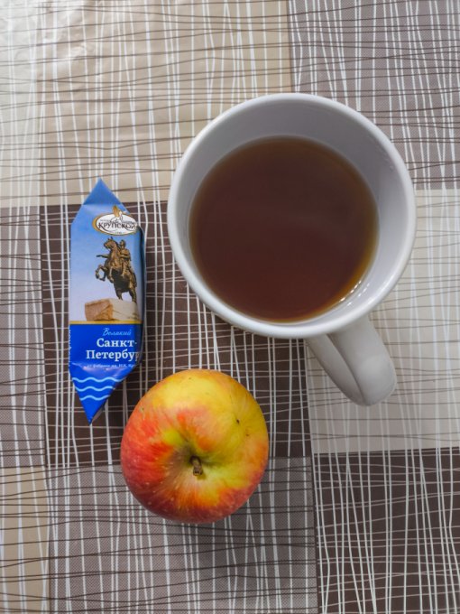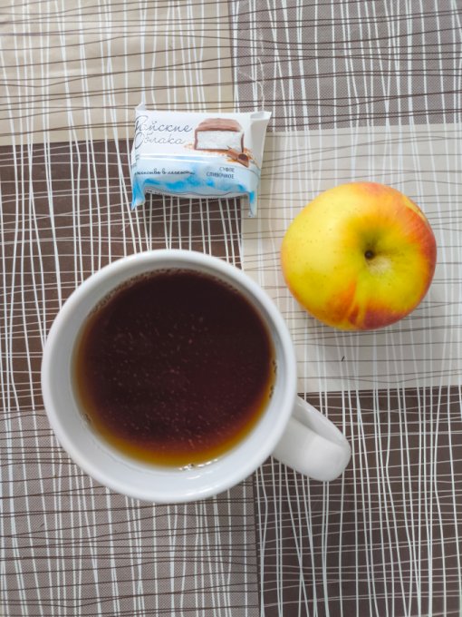 • Перекус: чай черный, яблоко, конфета суфле сливочное Райские облака глазированная.