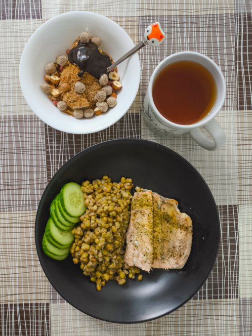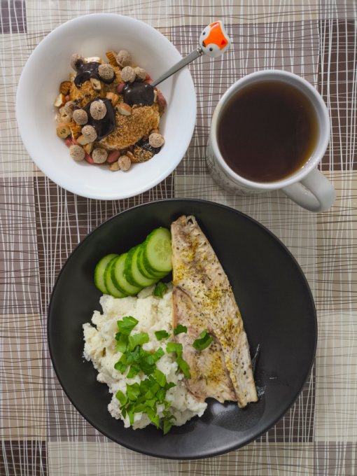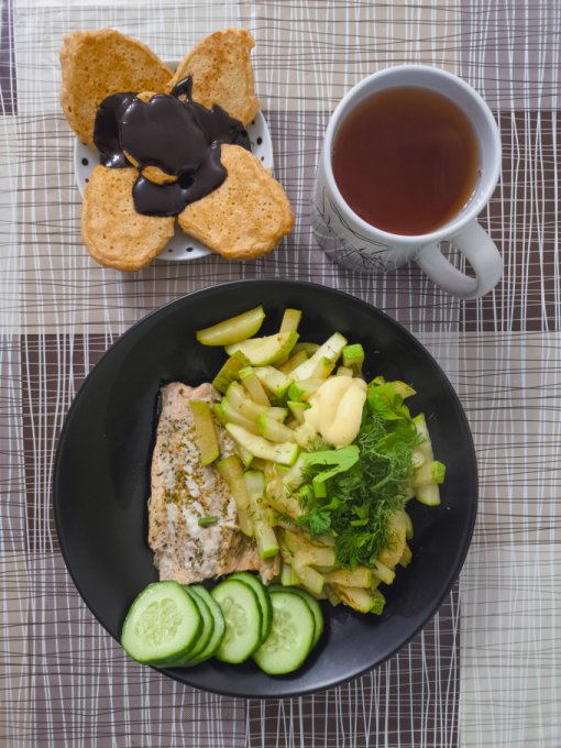 • Ужин: горбуша, кабачок жареный на сливочном масле с зеленью и Медово-горчичном соусом, огурец, чай черный, оладьи из красной чечевицы с низкоуглеводным соусом Молочный шоколад.
