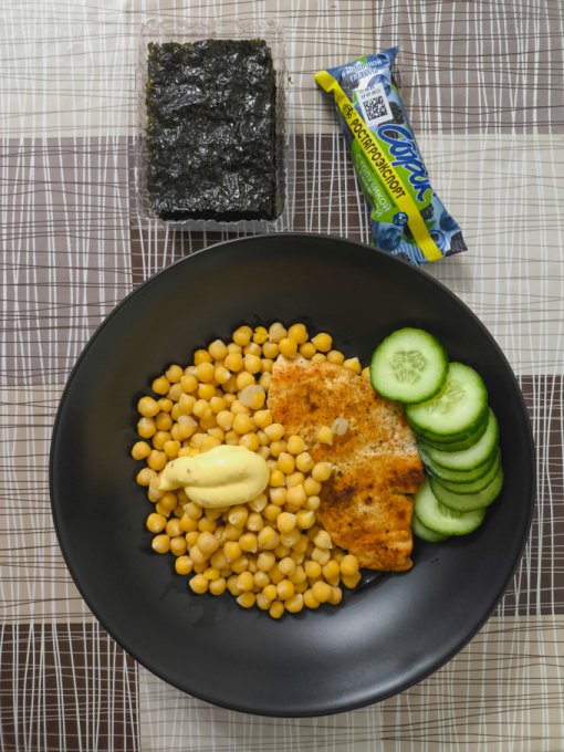 • Обед: куриная грудка жареная на пергаментной бумаге, нут с Медово-горчичным соусом, огурец, чипсы из нори, кофе черный, сырок творожный глазированный с голубикой и ежевикой.