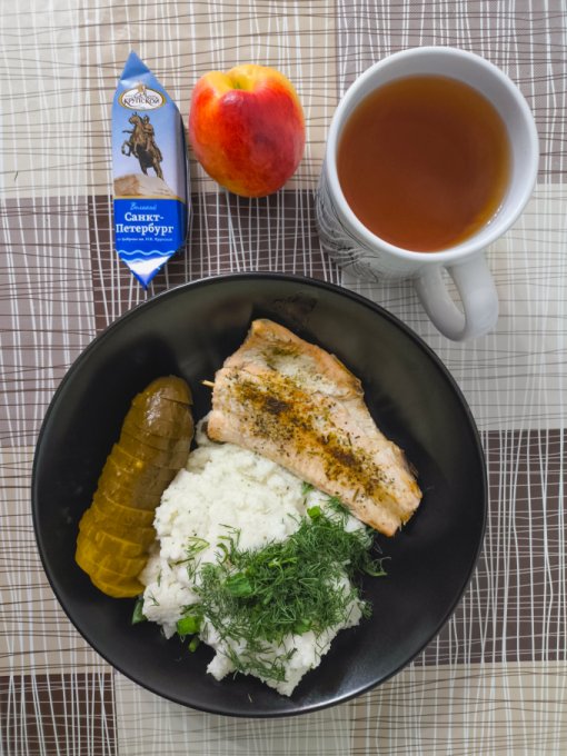 • Ужин: горбуша, пюре из цветной капусты на сметане с зеленью, огурец соленый, чай черный, нектарин, конфета вафельная Великий Санкт-Петербург.