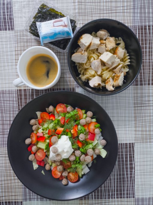 • Обед: куриная грудка жареная на пергаментной бумаге, макароны отварные, салат (томаты, огурец, красный болгарский перец, пекинская капуста, сметана, зелень, отруби Бородинские), чипсы из нори, кофе черный, конфета суфле сливочное Райские облака глазированная.