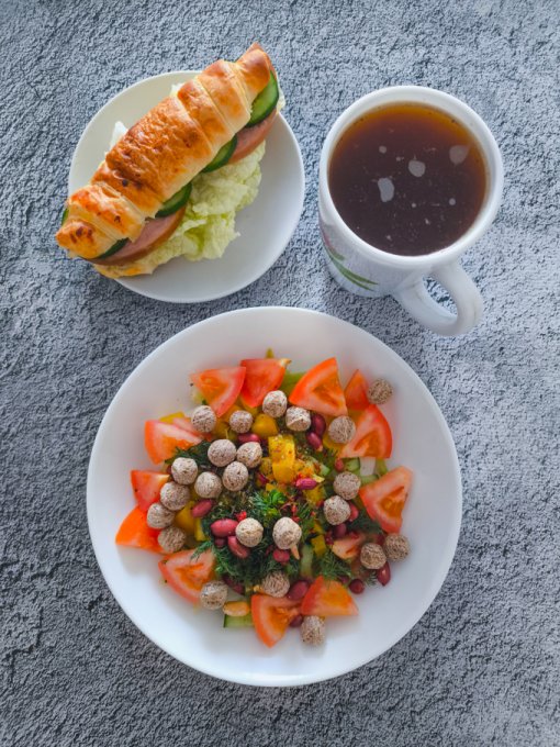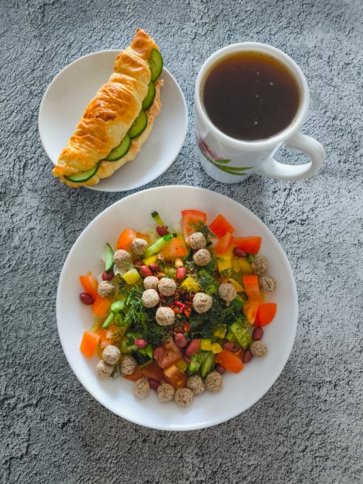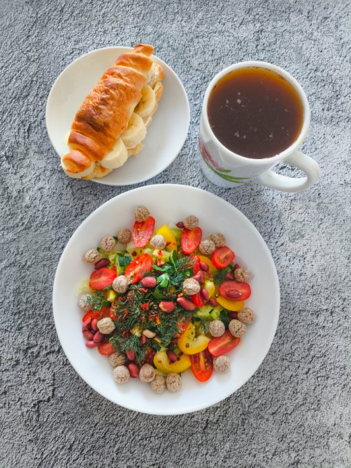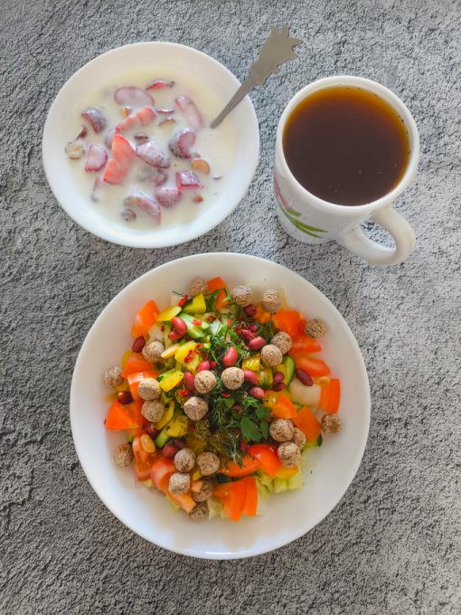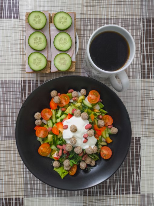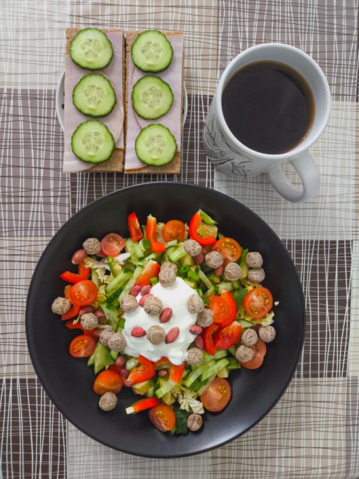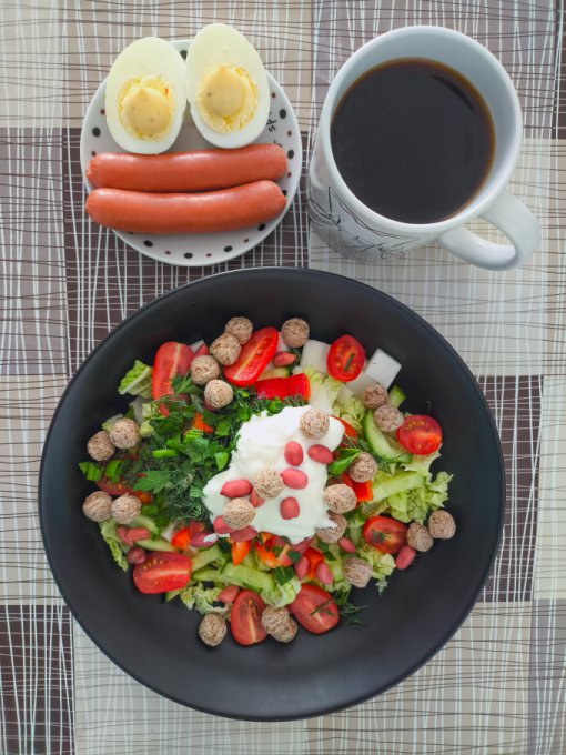• Завтрак: салат (томаты, огурец, красный болгарский перец, пекинская капуста, сметана, зелень, арахис, отруби Бородинские), цикорий, яйцо С0 и 2 сосиски Баварские вареные с Медово-горчичным соусом.