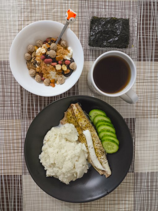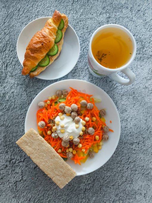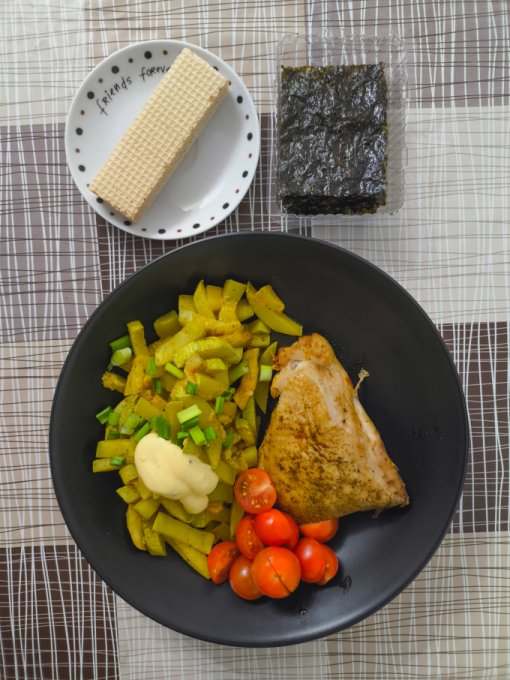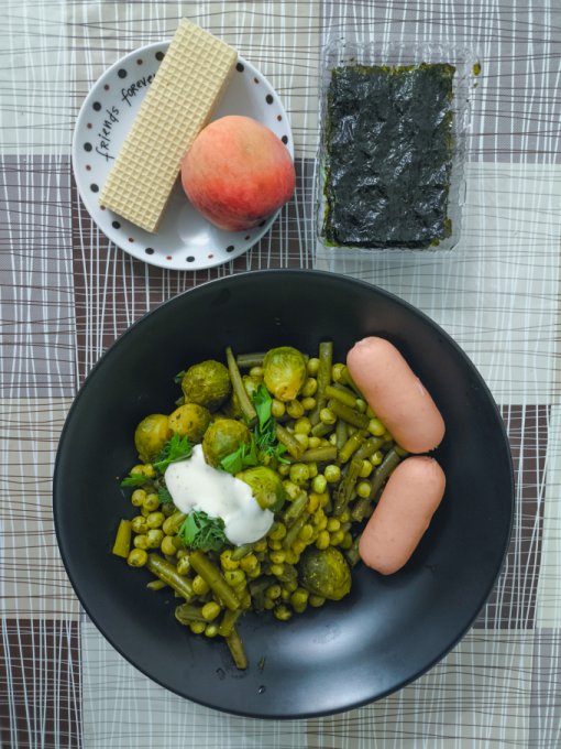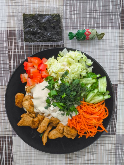 • Обед: домашняя шаверма (пекинская капуста, томат, огурец, перец халапеньо, морковь по-корейски, курица с соевым соусом, соус из сметаны с ряженкой и чесноком, зелень), чипсы из нори, кофе черный, конфета батончик с орехами.