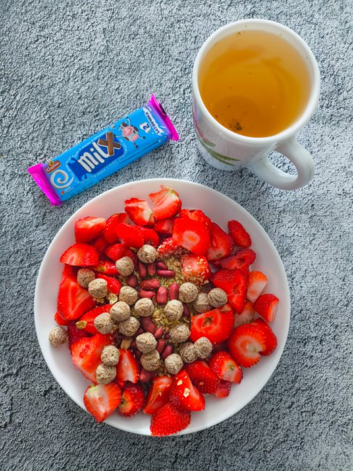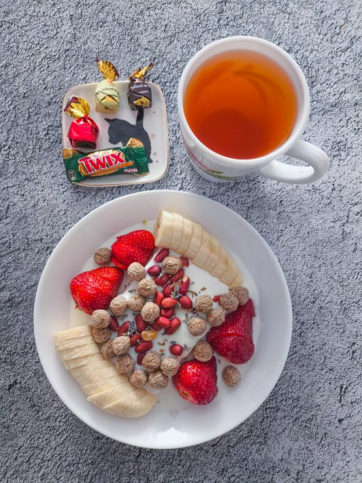 • Ужин: творог на кефире с бананом, клубникой, арахисом жареным, отрубями Бородинскими, чай черный, конфета Твикс Имбирное печенье, 3 конфеты шоколадные Забегай на чай.