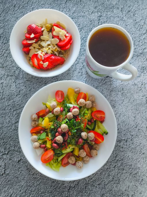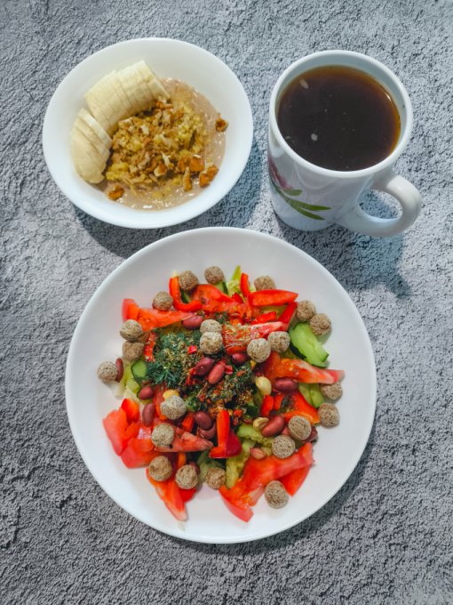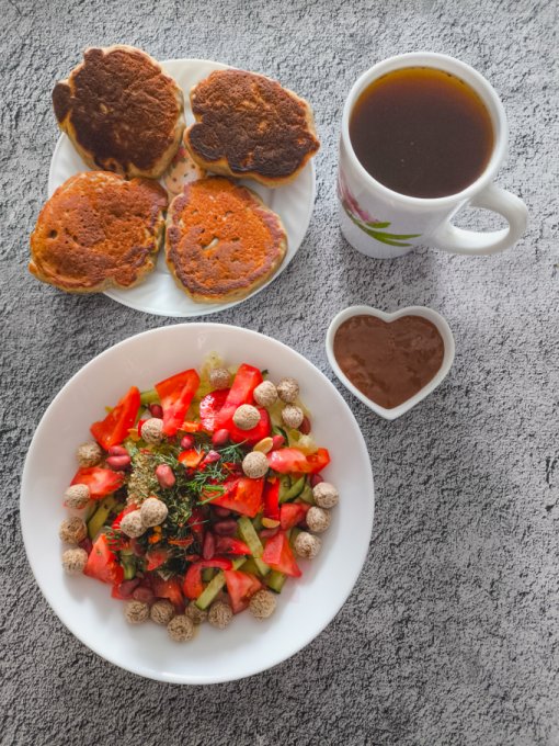 • Завтрак: салат (томат, огурец, красный болгарский перец, пекинская капуста, сельдерей, льняное масло, яблочный уксус, укроп, арахис жареный, отруби Бородинские), цикорий, оладьи из соевой и гречневой муки на кефире с низкоуглеводным соусом Молочно-шоколадный пудинг.