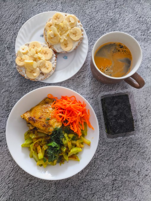 • Обед: куриное бедро, кабачок жареный на кокосовом масле с зеленью, морковь по-корейски, чипсы из нори, кофе черный, 2 хлебца со вкусом Черной смородины со сметаной, бананом и миндальными лепестками.