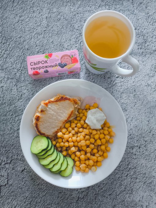 • Ужин: свинина жареная на кокосовом масле, нут вареный с зеленью и низкоуглеводным соусом Тартар, огурец, чай зеленый, сырок творожный глазированный с лесными ягодами и злаками.