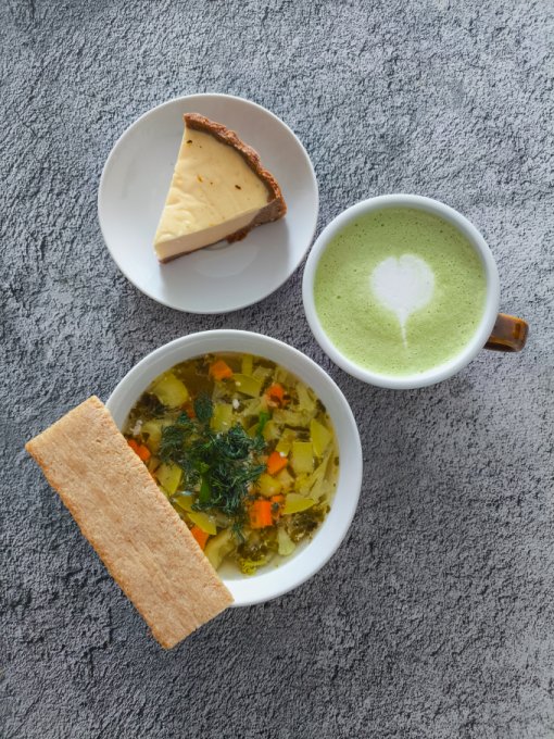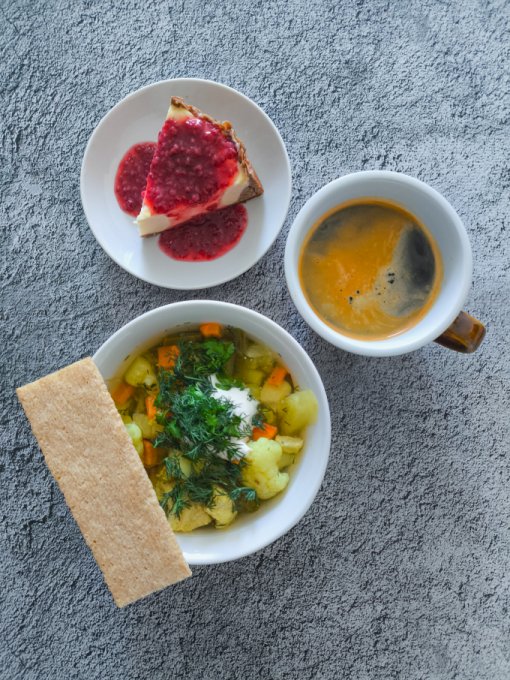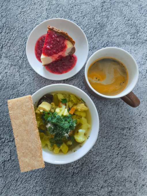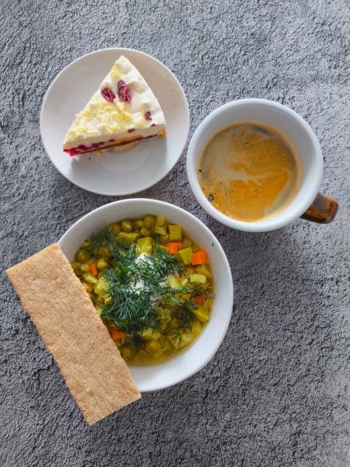 • Обед: суп на курином бульоне овощной с морской капустой, сметаной и укропом, хлебец со вкусом лука, кофе черный, торт Брусничный с белым шоколадом.