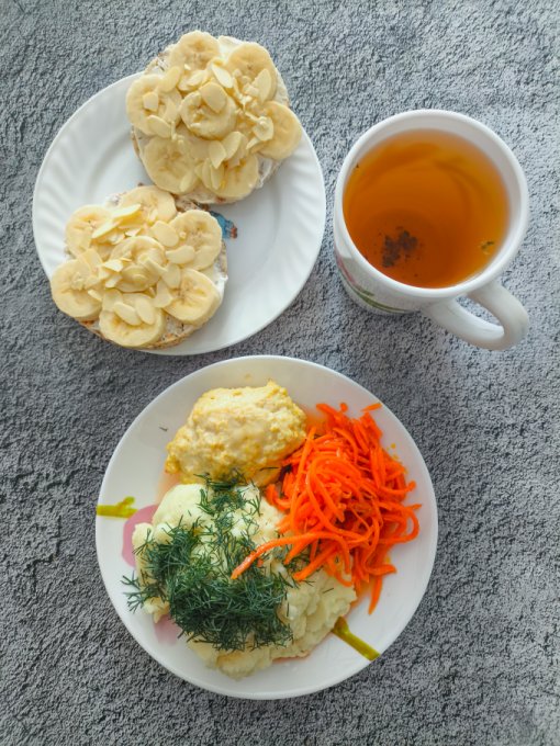 • Ужин: котлета куриная с кабачком и легким сыром, пюре из цветной капусты на сметане с укропом, морковь по-корейски, чай травяной, 2 хлебца со вкусом Черной смородины со сметаной, бананом и миндальными лепестками.