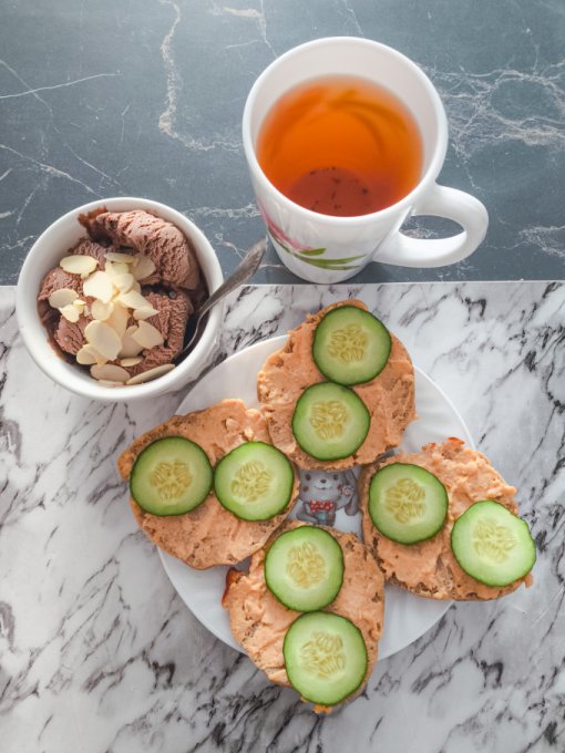 • Перекус: чай травяной, оладьи с риетом из лосося рубленного подкопченного и огурцом, мороженое пломбир Шоколадный с миндальными лепестками.