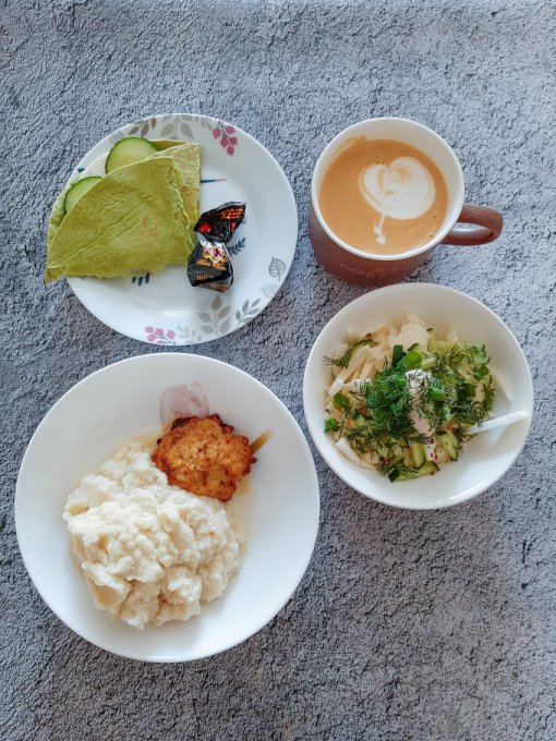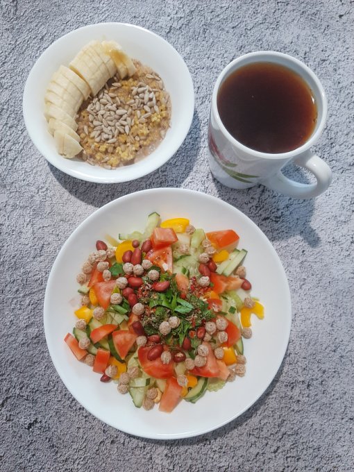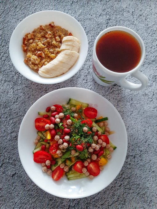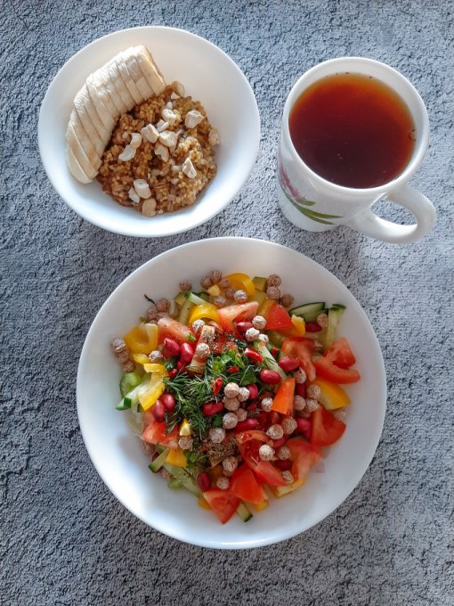 • Завтрак: салат (томат, огурец, желтый болгарский перец, пекинская капуста, сельдерей, авокадо, льняное масло, яблочный уксус, зелень, арахис жареный, отруби гречневые), цикорий, каша из пшенной и перловой круп на козьем молоке с бананом и кешью.