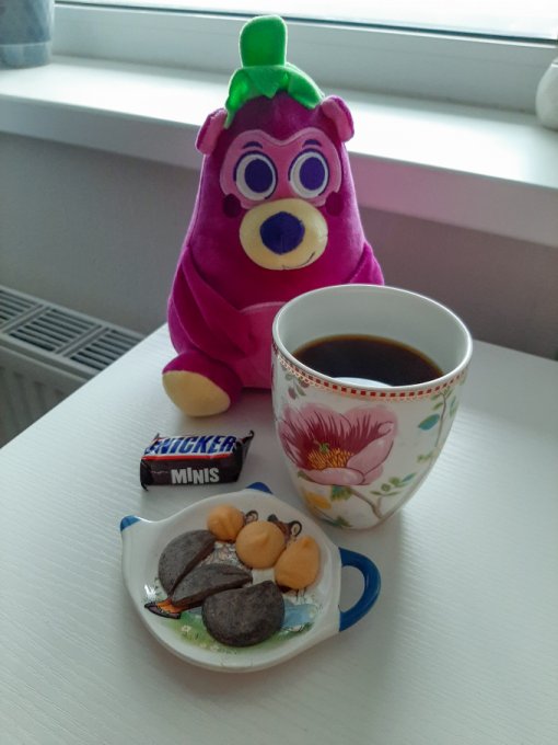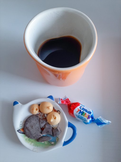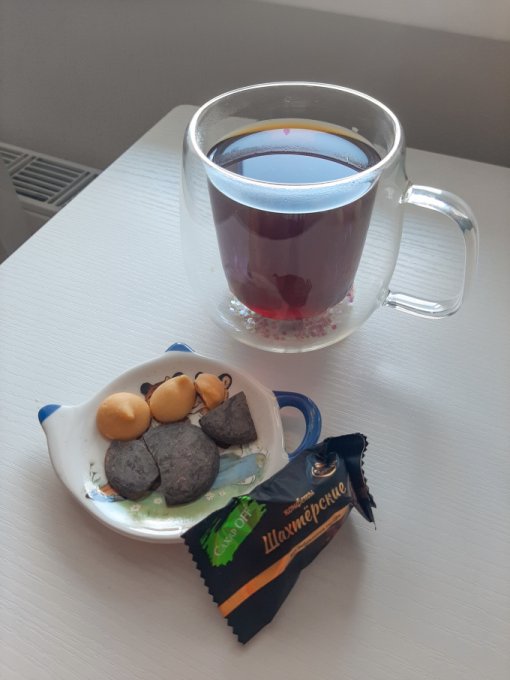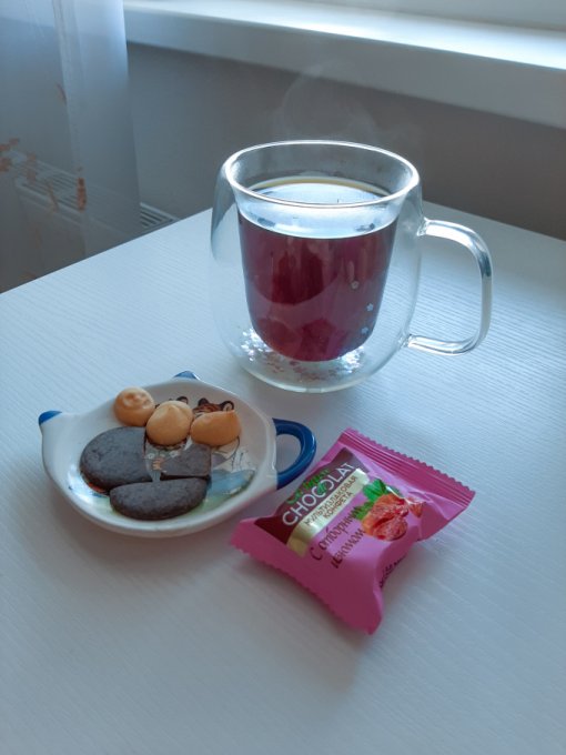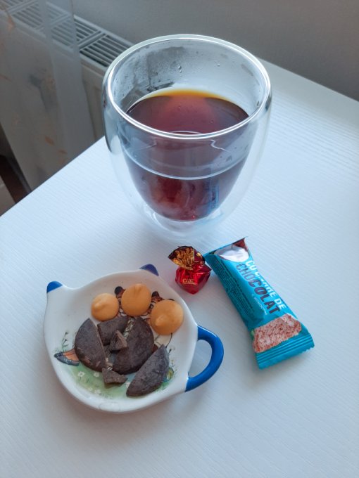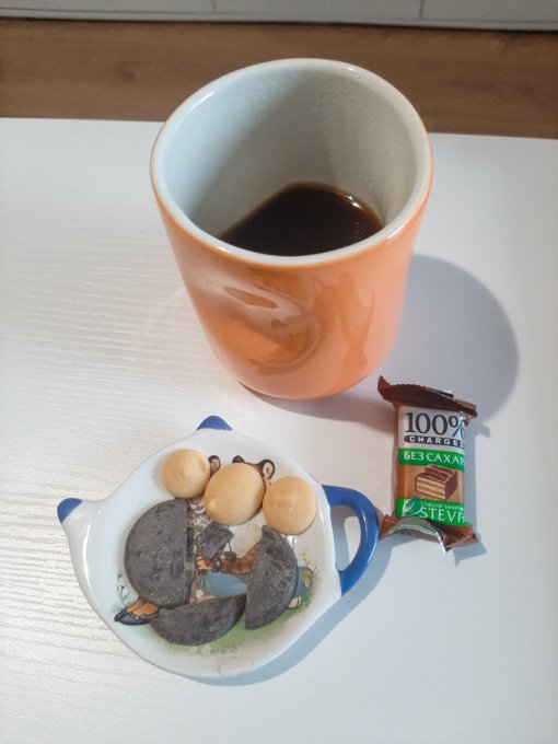 • Перекус: кофе в воронке V-60, белый шоколад без сахара, какао тертое в плитках, конфета мультизлаковая с изюмом.